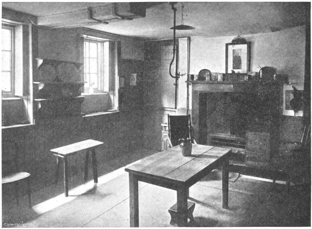 No description of Carlyle’s Chelsea home would be complete without mention of the kitchen where Mrs. Carlyle made marmalade “pure as liquid amber, in taste and look almost poetically delicate”; and where, too, she stirred Leigh Hunt’s endlessly admirable morsel of Scotch porridge. Readers of the Letters and Memorials will obtain many glimpses of this apartment and its occupants. The fittings were very old-fashioned, especially the open kitchen-range with its “kettle-crane” and “movable niggards.” The dresser which stood there in 1834 remains against the south wall; the table still stands in the centre, and there is a sink in the corner beside the disconnected pump.