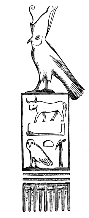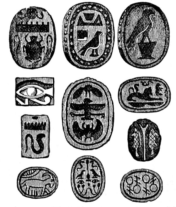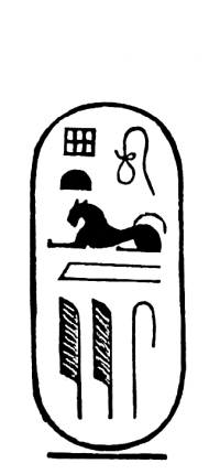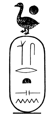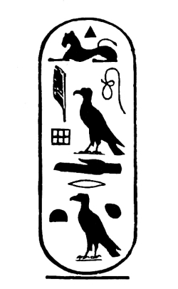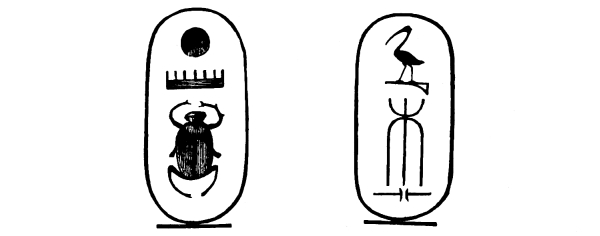 [7] Cartouche is a word introduced into Egyptology by Champollion; it signifies a scroll, or label, or escutcheon, on which the name of a Pharaoh is inscribed. Early Egyptologists had had their interest and curiosity awakened by observing the enclosure of certain hieroglyphs within an oval outline; and further research discovered that the ovals included hieroglyphs representing royal names and titles. The oval, or cartouche, is to be regarded therefore as the seal, or signet, or heraldic cypher of a king or potentate, and its presence on an obelisk or monument confers a right of authorship or proprietorship, and informs us to whom the monument belongs. The seal likewise typifies renovation and immortality, and on this account was selected as the badge of kings, to render immortality, which all Egyptians eagerly aspire to, the more secure. It is impossible to read Egyptian monuments correctly without a knowledge of the royal cartouches.