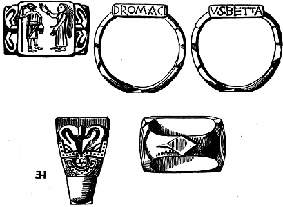 [520] O. M. Dalton, “Franks Bequest, Catalogue of the Finger Rings, Early Christian, Byzantine, Teutonic, Mediæval and Later [British Museum],” London, 1912, p. 138, Nos. 877, 878, 879; see Plate XV.
