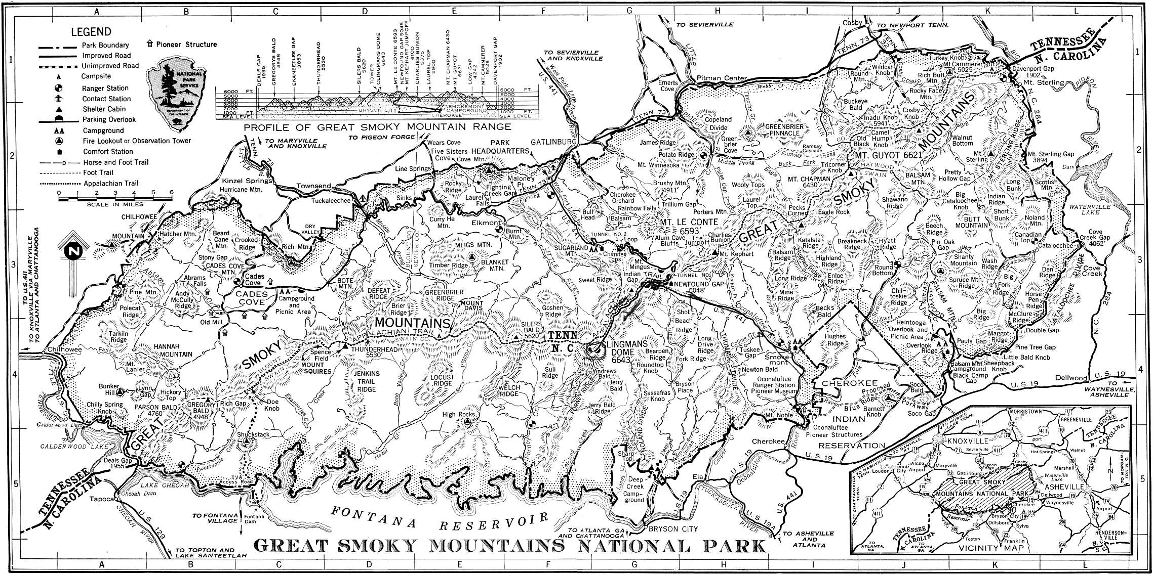 | Newfound Gap | 15 | 14.8 | 42 | 5048 | Where U. S. 441 crosses Smokies, Appalachian Trail, and Clingmans Dome Highway | G-3. |