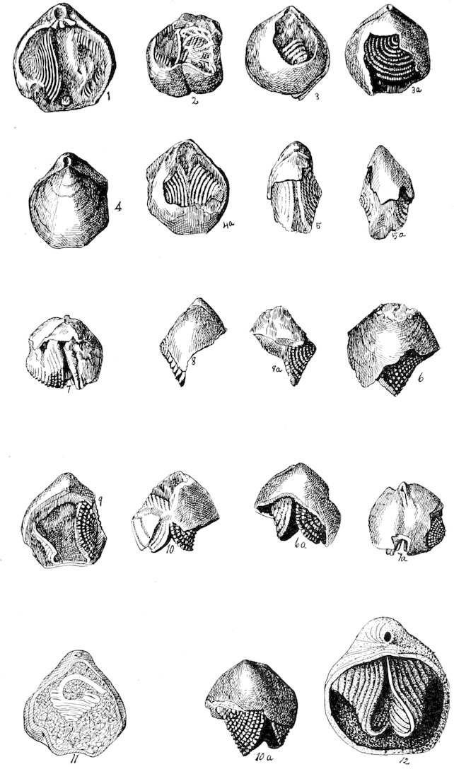 The spiralia of No. 10 are turned in a similar manner, but through a much smaller angle. The frontal aperture is typical, as is also the general form of the shell. The spiralia are conical, and the tips probably acute. In No. 6 the position of the spiralia, their form and that of the aperture are normal. Nos. 6 and 9 show spines on the spires. The spines are closely set, thick, blunt, and nearly twice as long as broad. In fact, some appear to be nearly as large at the tips as at the base. In No. 9 the spires are normal, except that, instead of being flaring conical, they are more in the shape of a folded shield shape with acute apex. In other words, the frontal aperture is produced by the dorso-ventral compression of the entire cone rather than the flaring of the frontal portion. The apex of the left spire is bent somewhat downward. The position of the spiralia in No. 7 is about normal, the tips obtuse, the spires almost perfectly depressed conical, frontal aperture only slightly wider than the space farther back on the side next the brachial valve. No. 5 has apparently been compressed laterally, through this compression did not affect the positions of the spiralia, for they are normal. They appear to have been of the typical form in every respect. In No. 8 the spires seem to have been turned through a slight vertical angle, though the incompleteness of the specimen prevents a close study of position. The form was apparently normal, except that the lower edges may have been somewhat pressed inward. Nos. 1 and 4 are about normal throughout. No. 2 is normal as far as can be seen, except that the apices are turned through a small vertical angle. The anterior portion of the pedicle valve is crushed in. No. 12 is normal throughout.
