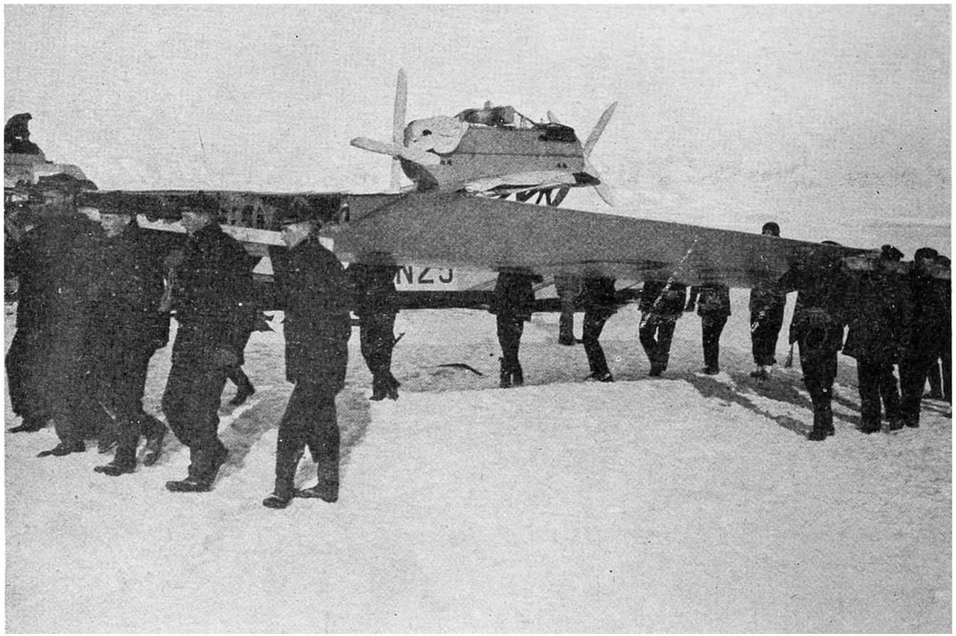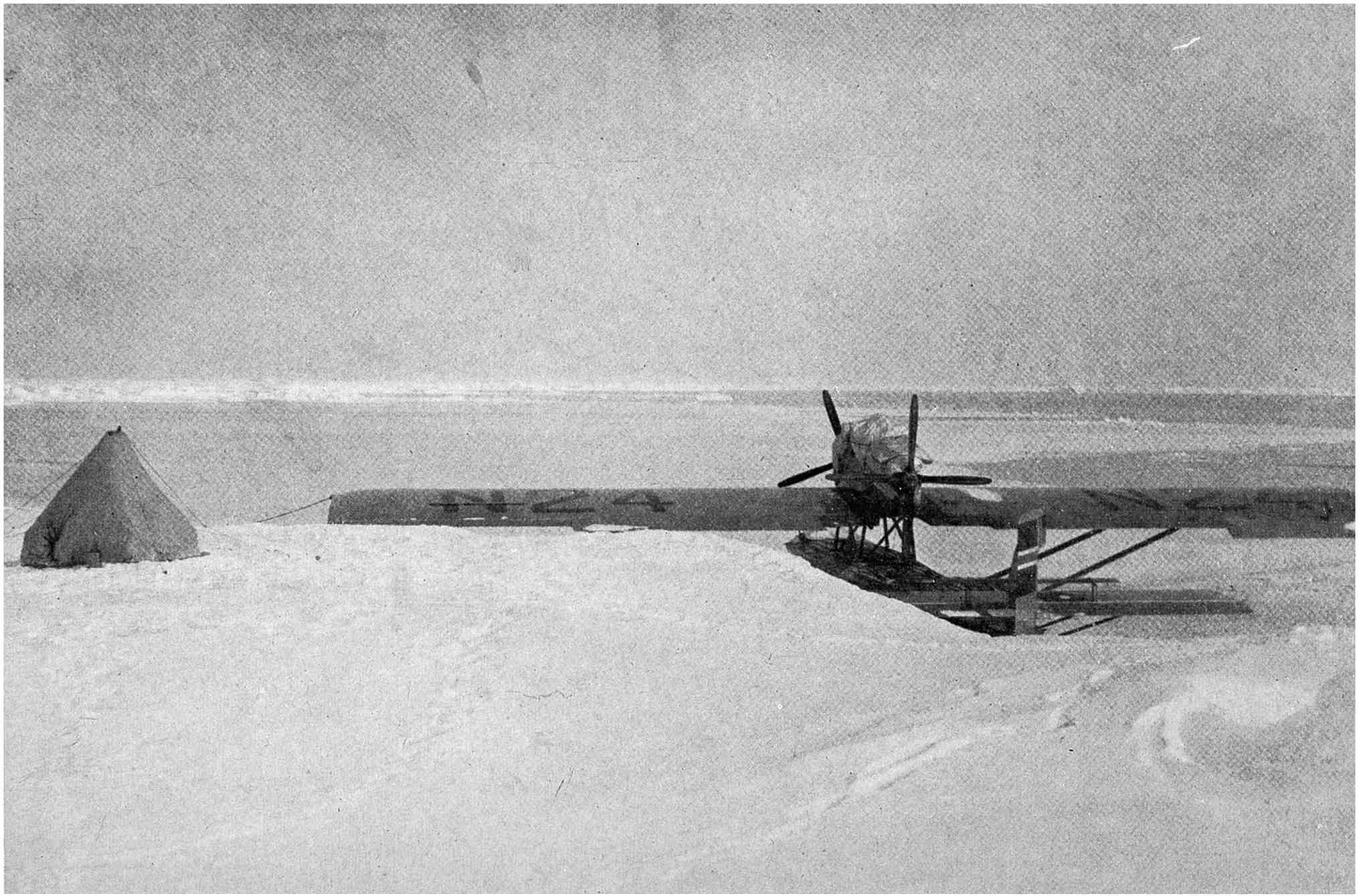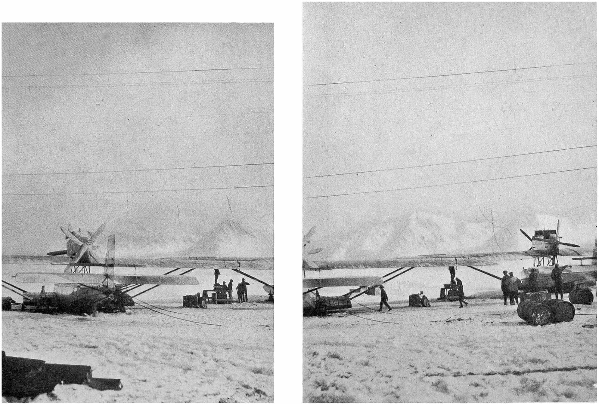 Herewith the task of the meteorologists was ended, and in the last unforgettable minutes we all stood as spectators, filled with admiration for the six brave men who smilingly said good-by as if they were just going on an everyday flying-trip. Not long afterwards both machines were out of sight in the bright blue sky flying in the direction of Cape Mitra.