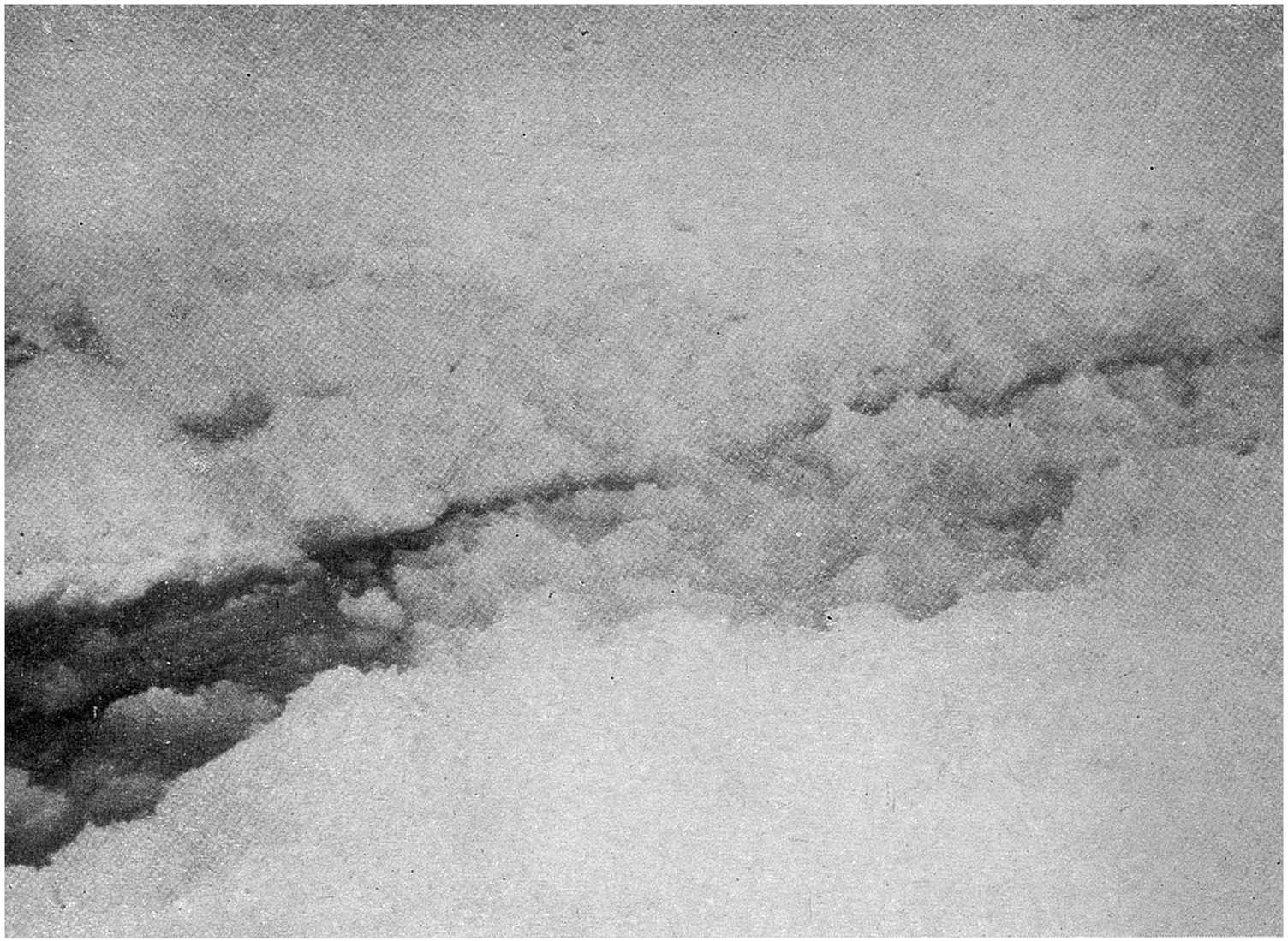 I cannot judge by personal examination because when twelve hours later we ourselves arrived up at Danskeöen on board the “Fram” there was not a sign of fog to be seen. But I am inclined to believe that the fog has been composed of a layer of certain low-lying clouds, which had often been seen by us at the beginning of May while we were lying in Syd Gat waiting for suitable weather for the expedition’s start. These clouds will often just form suddenly when a cold wind blows from the polar ice towards the open sea. The moment the air arrives over the first water-lanes or open sea it gets heated from below. The heated layer rises above and whilst ascending forms clouds. Other colder parts of the air then come into contact with the water, get heated and rise also forming clouds, etc. According to the observations which we had occasion to make at Danskeöen in the beginning of May, the lower surface of these clouds is about 200 meters from the ground. Below this there is generally a thick mist of fine snow which reduces atmospheric visibility and will certainly be very disturbing for flying. Luckily these clouds do not reach to any great height, seldom over 1,000 meters, so that369 one can easily fly above them. Besides, one can count on their not forming further north than where one finds open water channels of fairly large dimensions. It is therefore not too risky to undertake a flight above the cloud-belt towards clearer weather farther north.