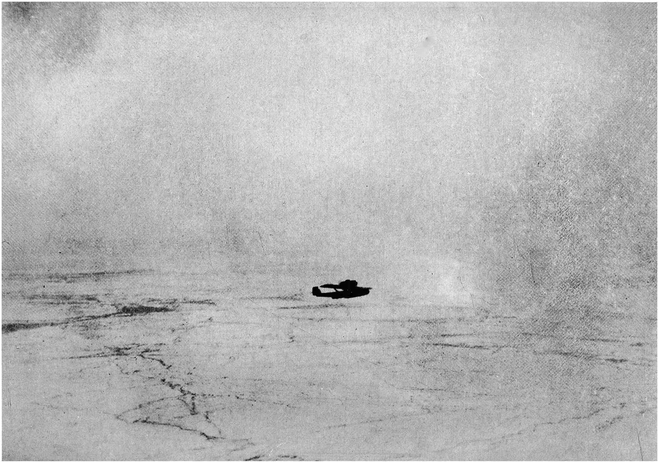 The landing took place in a light wind, therefore probably near to the center of the high pressure region, which covers the Arctic Sea. On the way into the high pressure region the wind, however, must have been considerably stronger as is shown by the very considerable deviation of 250 kilometers on an eight hours’ flight. In the middle period of the flight it must370 therefore have been thirty kilometers per hour, which is considerably more than the pilot observations over King’s Bay had shown, namely, twenty kilometers per hour. The aeroplanes must have flown, therefore, through a zone with strong northeasterly winds blowing north of Spitzbergen, and then later come into calmer wind conditions nearer the Pole.