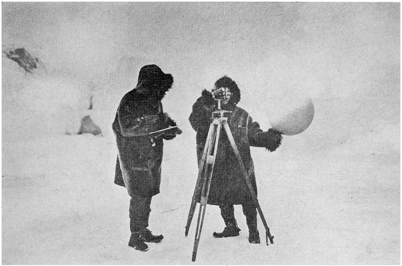 With the execution of all these pilot balloon observations, under conditions which were continually361 changing and often difficult,* Mr. Calwagen had to use all his care and all his skill. It can certainly be said that he made use of every possibility imaginable in order to collect data which might be helpful in supplementing the expedition’s weather forecasts.