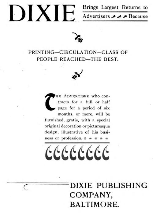 “The initial number presents an artistic and attractive appearance. The paper used is of specially fine quality, and typographically Dixie is all that can De desired.”—The Baltimore Telegram, Jan. 28, 1899.