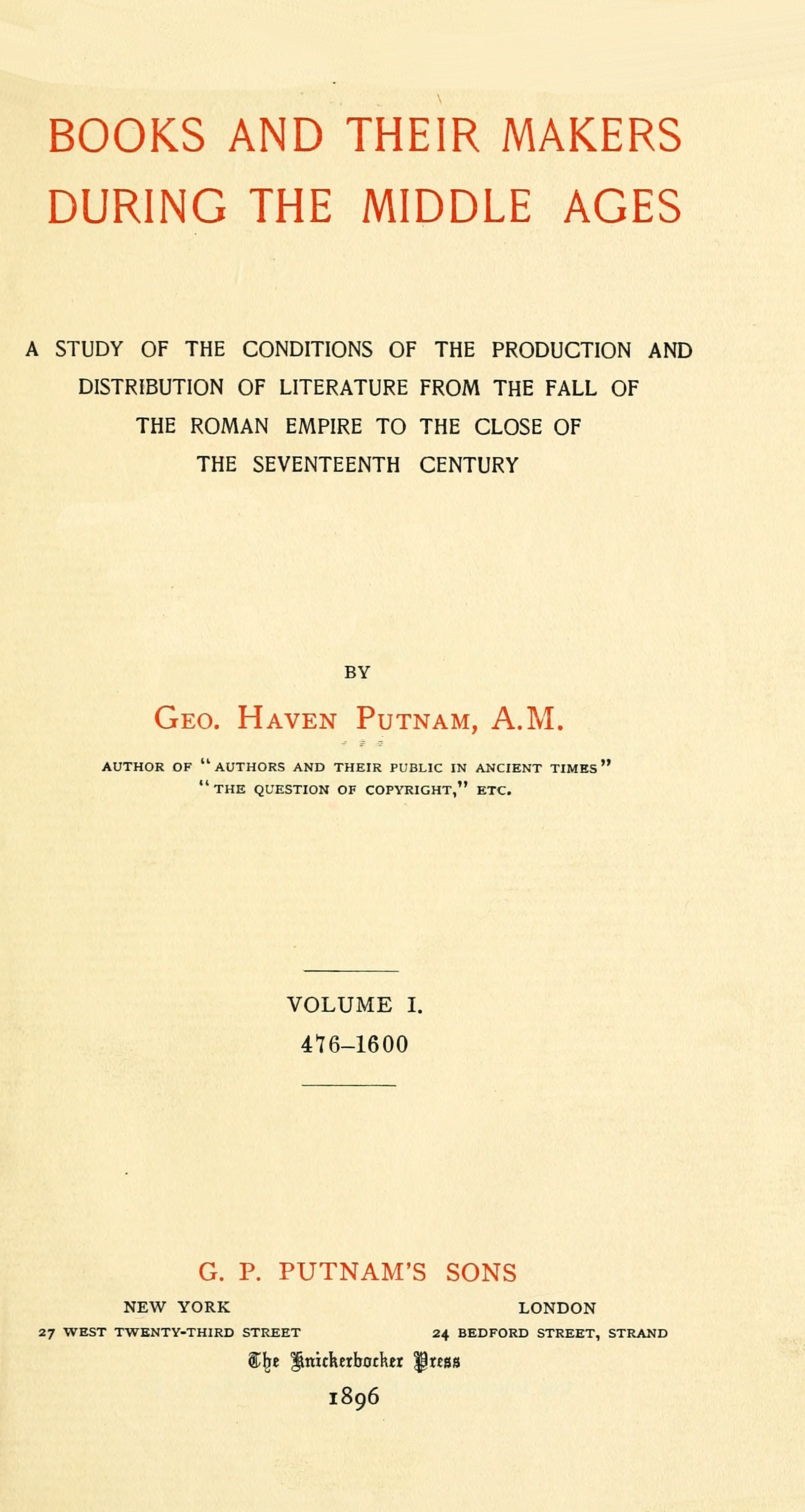 The First Printer-Publishers of France.—The Later Estiennes and Casaubon.—Caxton and the Introduction of Printing into England.—The Kobergers of Nuremberg.—Froben of Basel.—Erasmus and his Books.—Luther as an Author.—Plantin of Antwerp.—The Elzevirs of Leyden and Amsterdam.—Italy: Privileges and Censorship.—Germany: Privileges, and Book-Trade Regulations.—France: Privileges, Censorship, and Legislation.—England: Privileges, Monopolies, Censorship, and Legislation.—Conclusion. The Development of the Conception of Literary Property.—Index to the Work.