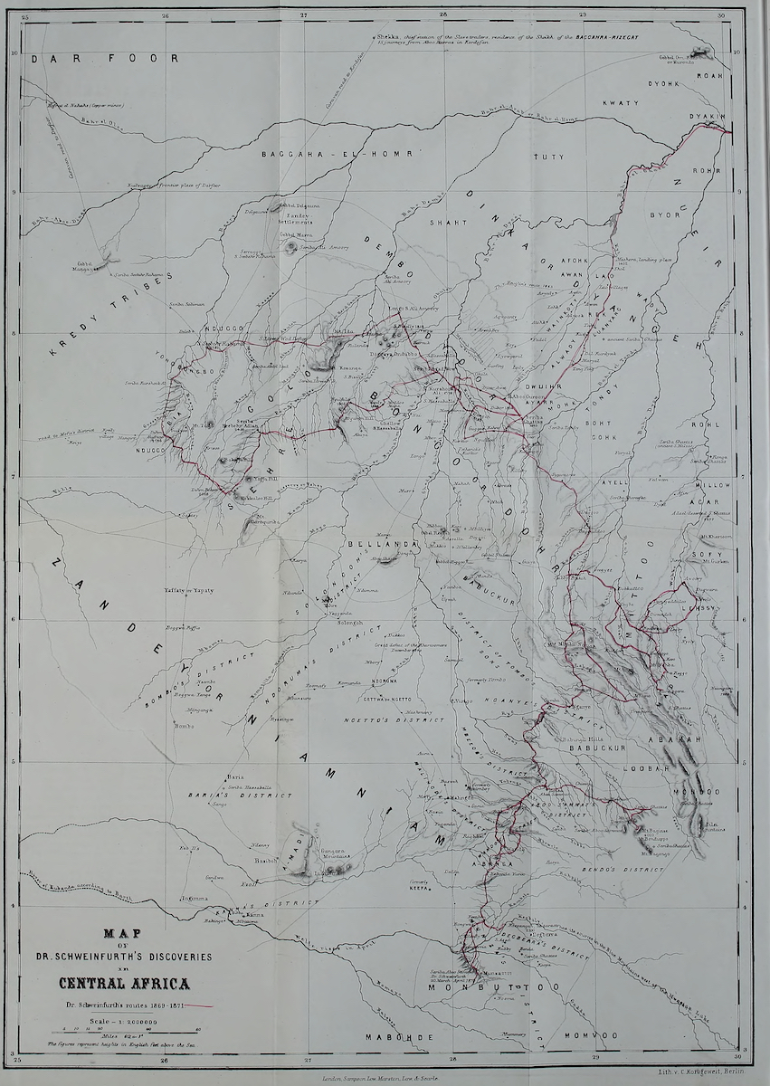 It is my purpose in making these remarks to show what facilities for geographical research are afforded by the power and good will of Egypt. In former times the explorer began at the Nubian Desert or the Red Sea; he might be plundered of all that he possessed before he entered negro Africa at all. Supposing he arrived safely in Sennaar, he was at once exposed to those vexatious extortions and delays which so frequently robbed him of his money and his health before he had opened new ground. As it is, a firmam from the Viceroy obtains him men and boats from the governor of Khartoom, and therefore his point of departure is shifted many degrees to the south. He is now able to penetrate into the heart of Africa before he encounters an independent chief. The area of the firmam is immense, but beyond that area the dangers and difficulties of travel are perhaps increased by the aggressive policy of Egypt. The princes of Darfoor and Waday have a constant dread of annexation, and a European traveller, if he entered those countries, would find it difficult to obtain his congé. The west forest region which lies south of Darfoor and[Pg vi] Waday, and also along the main stream of the Nile, has always been a slave-hunting ground; annual raids are made from Darfoor and Waday, the hunters taking out licences from their kings,[2] and the Egyptian company of bandits, whom Sir Samuel Baker recently dispersed, hunted the land south of Grondokoro. These wars unsettled the country and rendered it difficult for travel. The slave-hunters intrigued against the European, fearing that he would expose them to the government at Cairo; and the slave-hunted had learnt to regard all white men as their foes and oppressors. Thus it has happened that out of a host of men who have attempted to penetrate Africa from north to south only two have achieved success. The first and foremost of these is Sir Samuel Baker; the second is Dr. G. A. Schweinfurth, the author of this work.