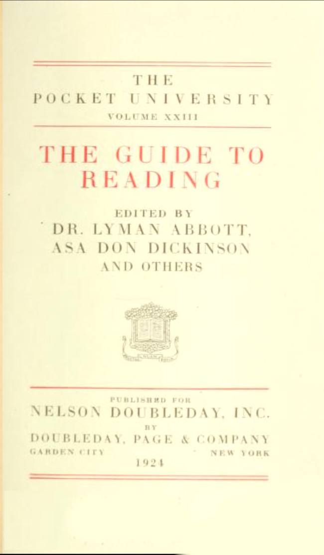 The elaborate, systematic “course of reading” is a bore. After thirty years spent among books and bookish people I have never yet met anyone who would admit that he had ploughed through such a course from beginning to end. Of course a few faithful souls, with abundant leisure, have done this, just as there are men who have walked from New York City to San Francisco. Good exercise, doubtless! But most of us have not time for feats of such questionable utility.