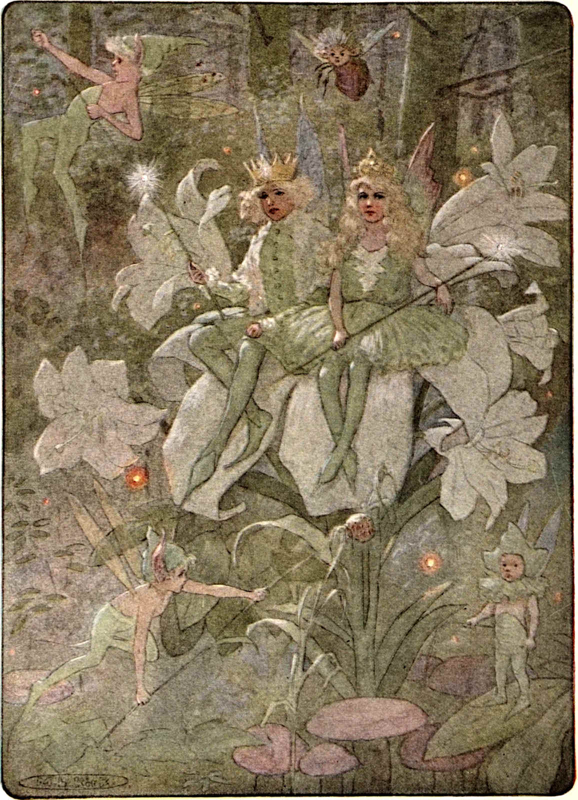 Between two great rose-bushes, which formed a triumphal arch of beautiful red blossoms, came a company of merry little faeries, blowing through white trumpet-shaped lilies, followed by a number of crickets creaking in the most lively manner; then came a band of elves ringing bunches of bluebells, which chimed silver music; next marched some fays dressed in thistle down, playing with blades of grass on drums made of empty acorn cups with rose leaves stretched tightly across them; a company of fierce-looking bumble-bees carrying thorns for swords came next; and then a number of beautiful girl faeries in lily-white dresses danced along, singing gaily. After these appeared Oberon and Titania, riding upon two purple-winged butterflies, and the rear of the procession was guarded by a company of soldier elves, and lastly a disorderly crowd of faeries, who played a thousand merry tricks upon one another as they ran along.