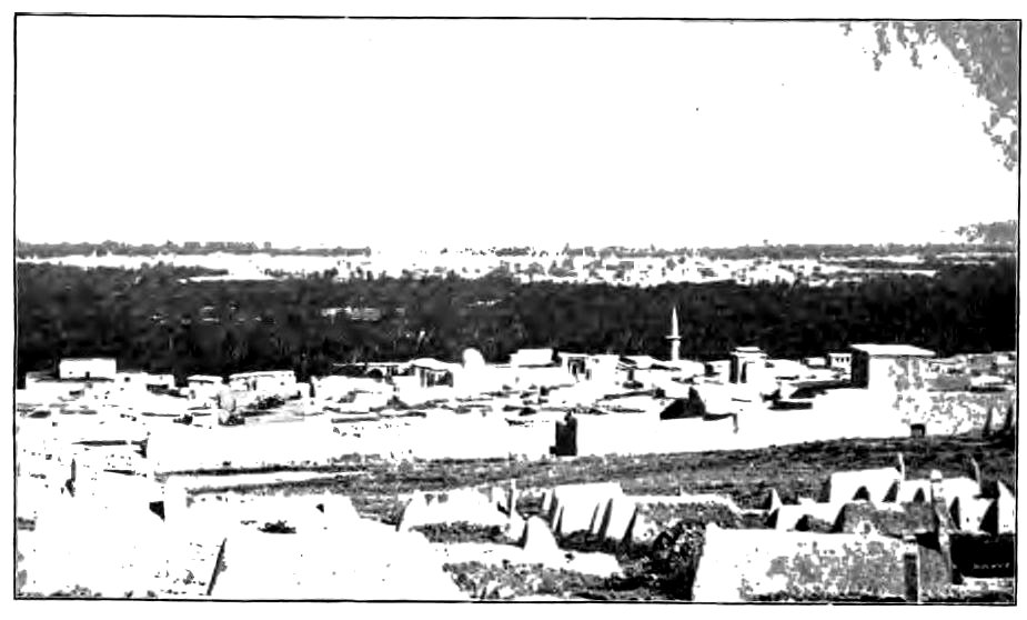 Between Salahíyyeh and Damascus is a quarter of an hour’s ride through gardens and orchards. I had 372heard of them often, and of the beautiful white city, with her swelling domes, tapering minarets, and glittering golden crescents looming against the far horizon of the distant hills. So I had heard of Damascus, so I had pictured it, and so I often saw it later; but I did not see it thus on this my first entrance to it, for it was winter. As we rumbled along the carriage road I asked ever and again, “Where are the beautiful gardens of Damascus?” “Here,” said the kawwass, pointing to what in winter-time and to English eyes appeared only ugly shrubberies, wood clumps, and orchards. I saw merely scrubby woods bordered by green, which made a contrast to the utter sterility of Es Sáhará. We passed Dummar, a village which contains several summer villas belonging to the Wali (the Governor-General of Syria) and other personages. The Barada ran along the right of the road, and gradually broadened into the green Merj, which looked then like a village common. And thus I entered Damascus.