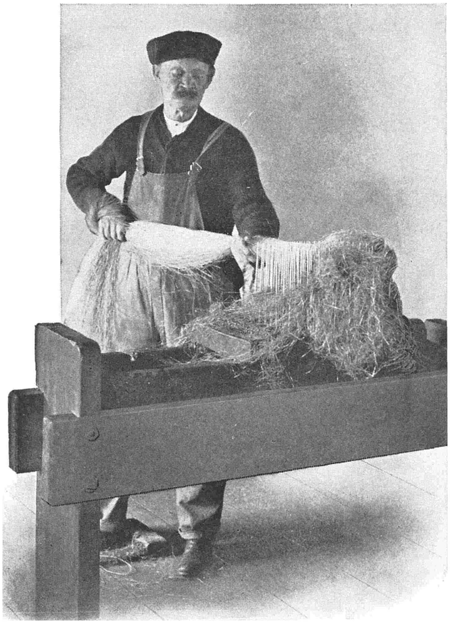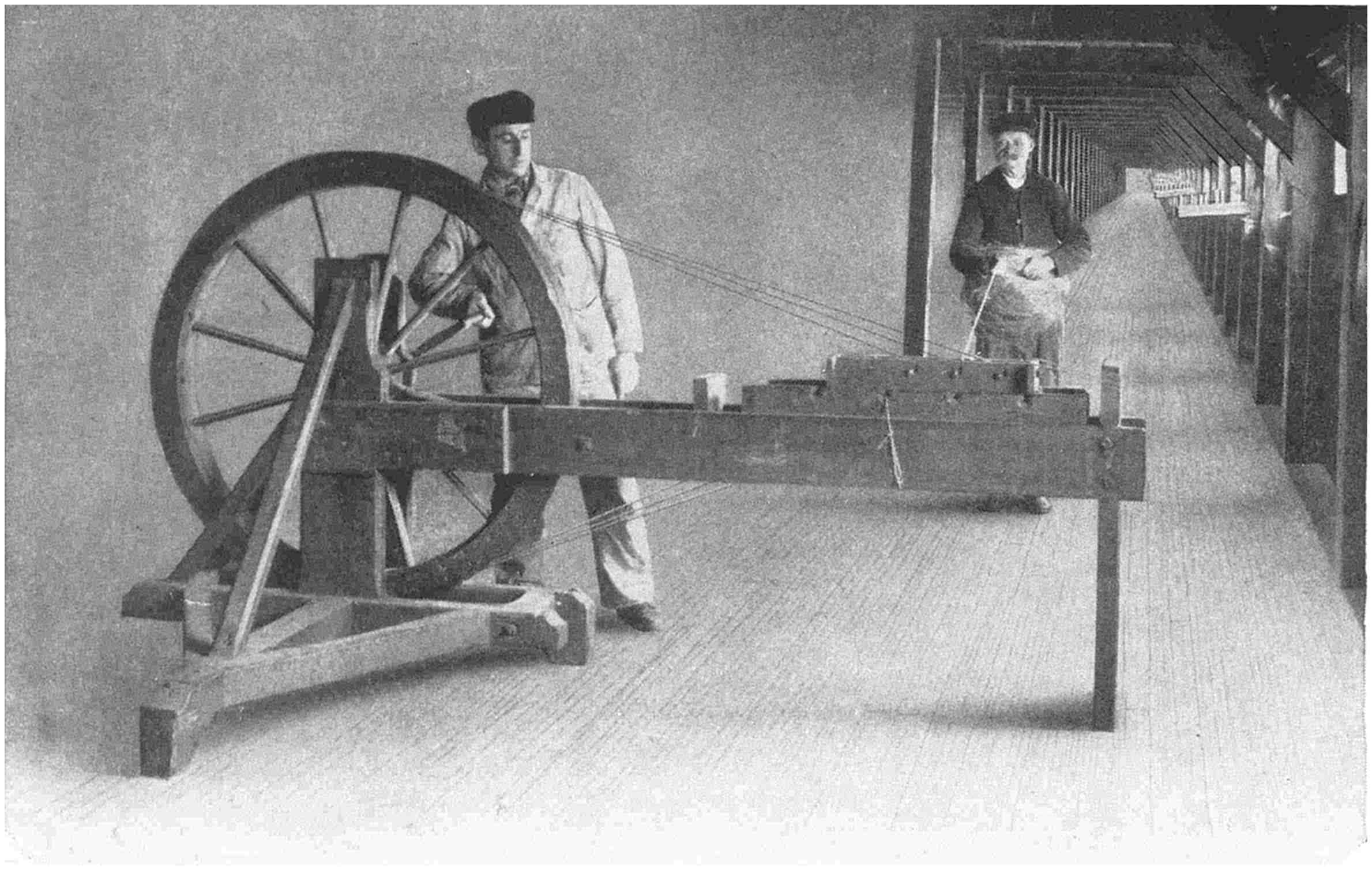 The forming machine—a heavy carriage surmounted by the band-rope wheel into which are geared several spindles and a driving drum—is now drawn up, and each group of yarns is attached to a separate spindle as shown opposite. A rope made fast at either end of the walk is given a few turns around the drum, the band-rope is set in motion and the machine moves off, leaving in its wake the compactly twisted strands.
