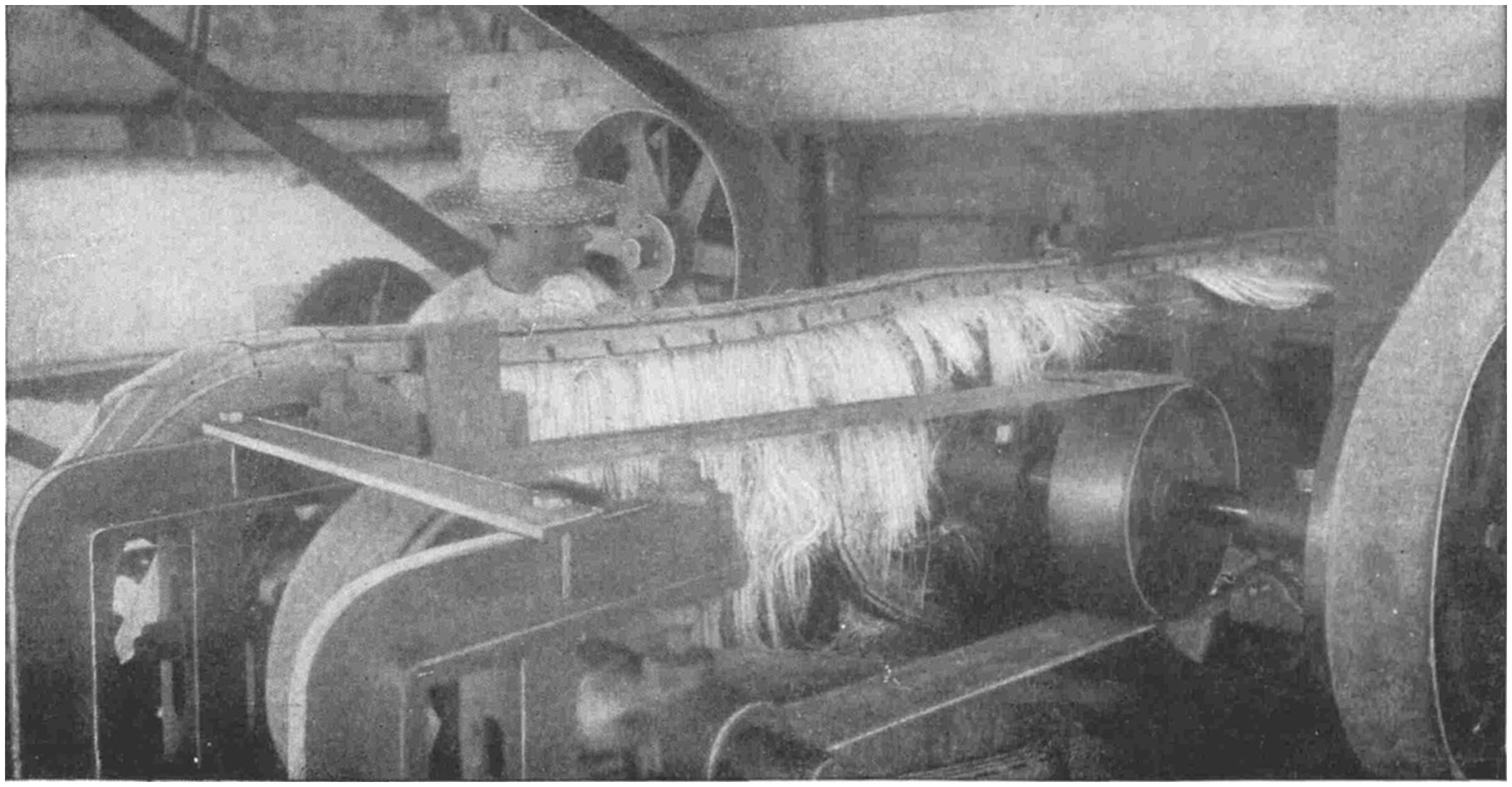 The feed portion of the machine, as can be seen in the picture below, consists of a revolving endless chain fitted with fine steel pins, and by these the fiber—now in the sliver form given it in the preparation room—is drawn from its bundle and carried toward a tube which can be adjusted to regulate the size of the yarn as desired. Into this tube the fiber disappears in a fashion only to be described by the single word “whisked.”