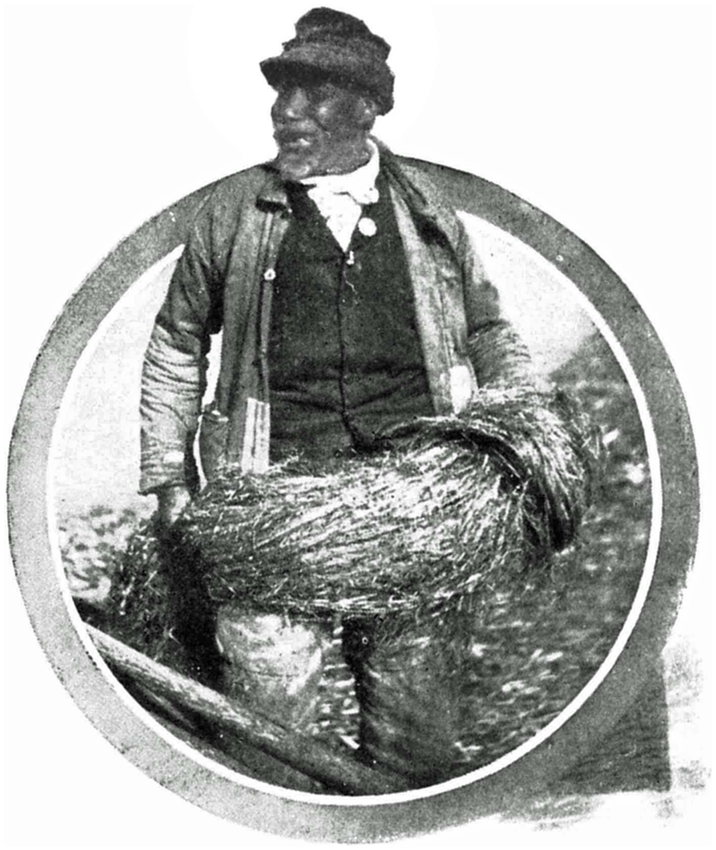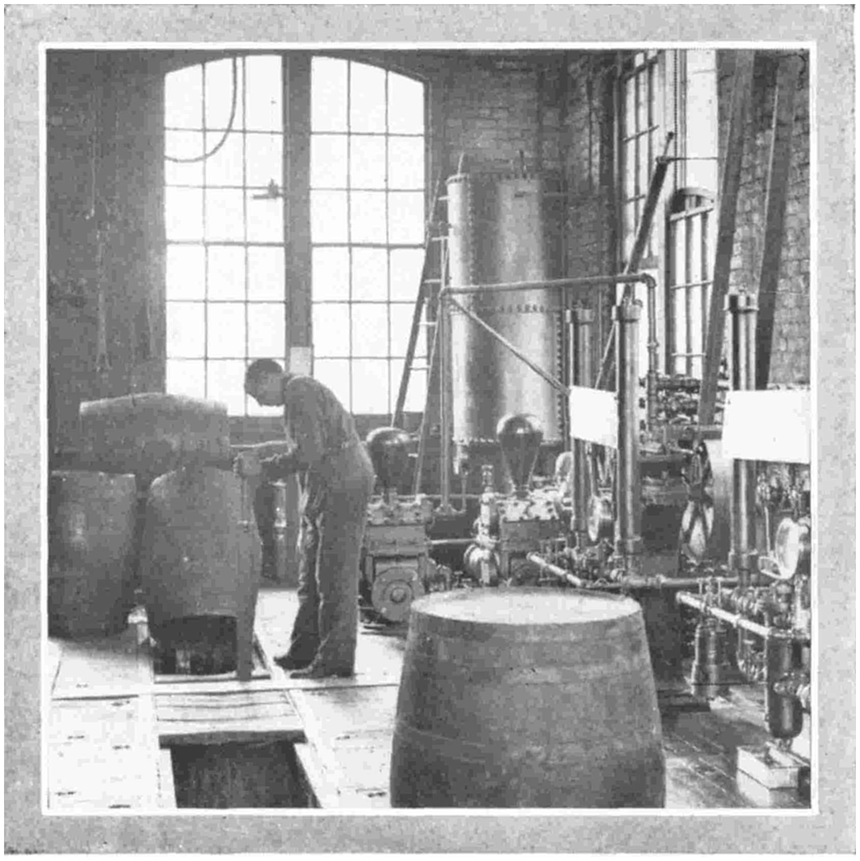 The picture on the next page illustrates how the yarns unwind from the bobbins, onto which they have been wound in the spinning process, and pass on into the “copper.” The plates which keep the yarns under the tar are shown elevated above the surface to give a clearer idea of their operation. As the heavily saturated yarns come from the “copper,” they are compressed78 between two rollers, adjusted to leave in the yarn as much or as little tar as needed for the particular goods being made and to turn back the surplus.
