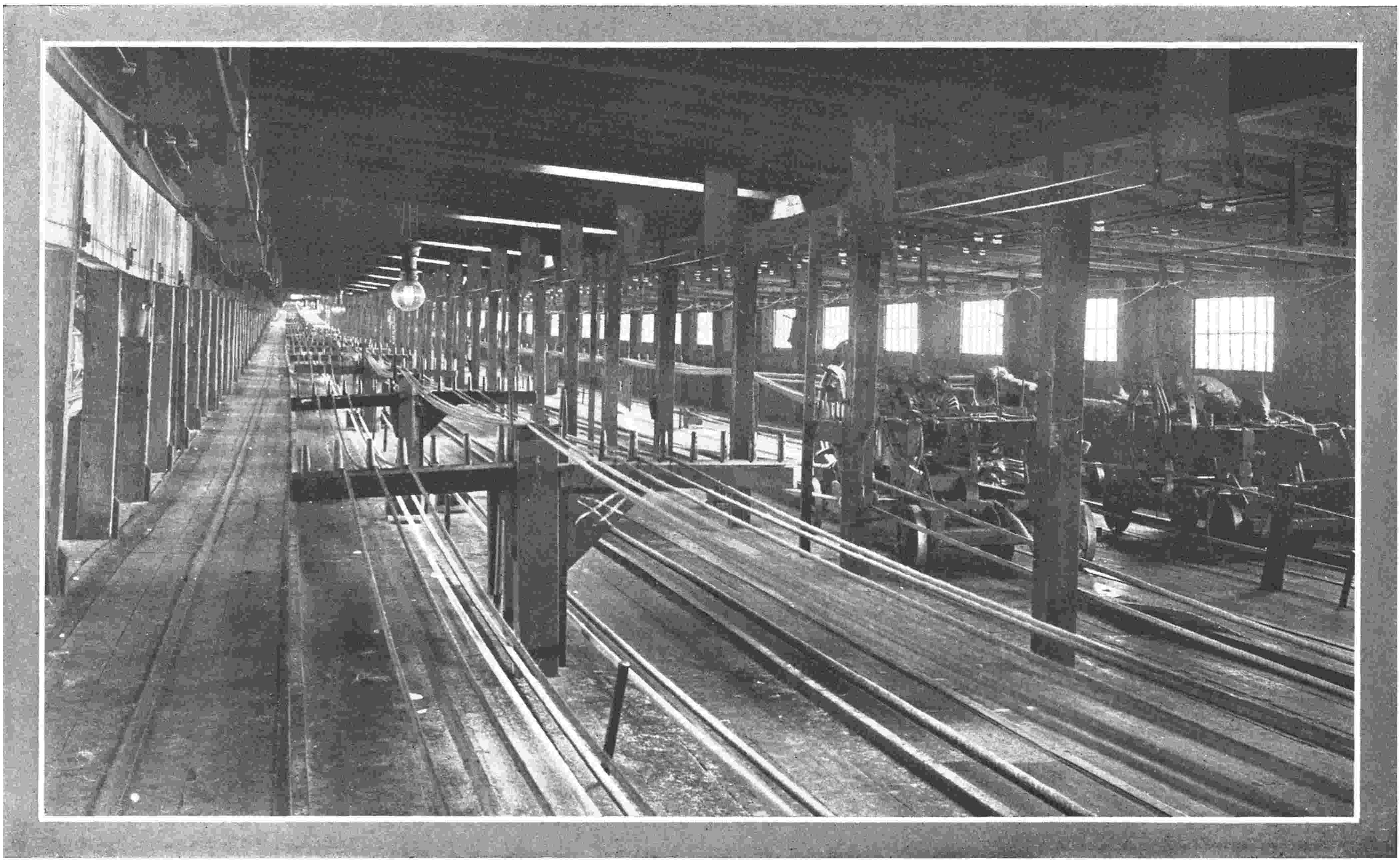 The spinning room, with its hundreds of flyers, each running in the neighborhood of 1,500 revolutions a minute, speaks eloquently of the years’ changes. Gone is the “drowsy dreamy sound” of the wheel in Longfellow’s “Ropewalk,” and in its place we hear the high singing noise of the gears—the voice of modern industry. And with the changes have come more rapid and economical production, better hours and pay for the workman, better rope for the consumer.