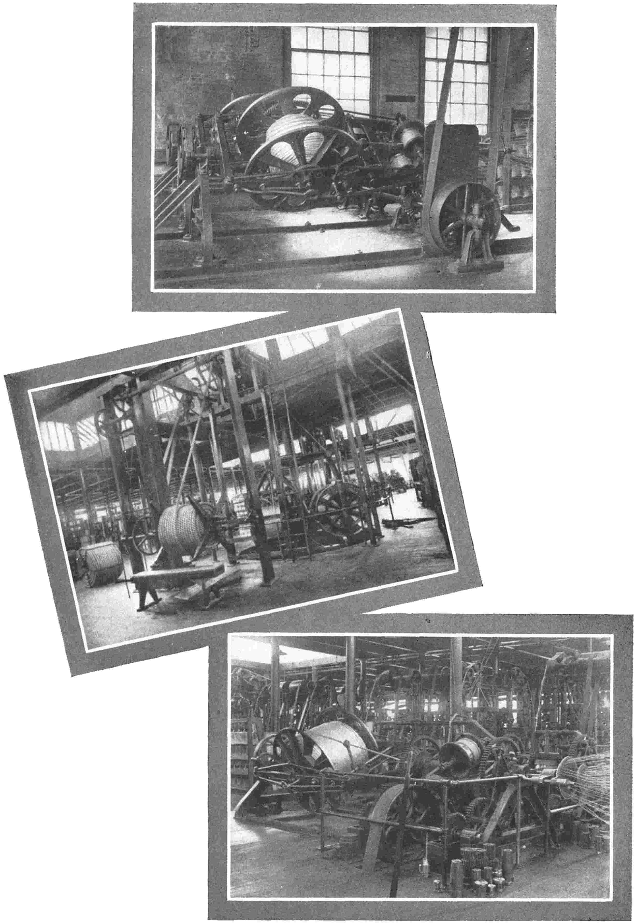 Three men usually suffice on the strand-making—one to tend the machines, the others to tend the bobbins which turn on fixed posts and can be renewed as needed without interrupting the process.