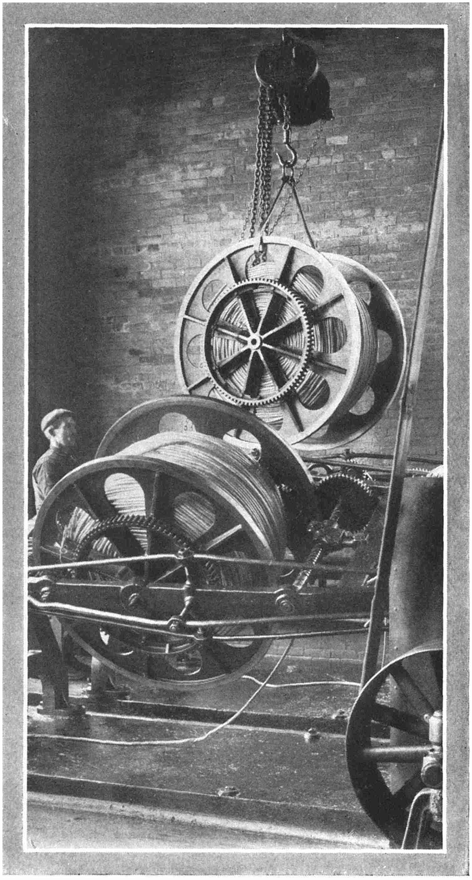 For the laying process, in which the strands are united to make a rope, the full reels are removed from the forming machines by overhead chains, as shown on the opposite page, and by like means are placed in the vertical flyers of the laying-machine. The strands pass through openings in the top-piece just above the flyers and converge into a central tube still higher up to form the rope.