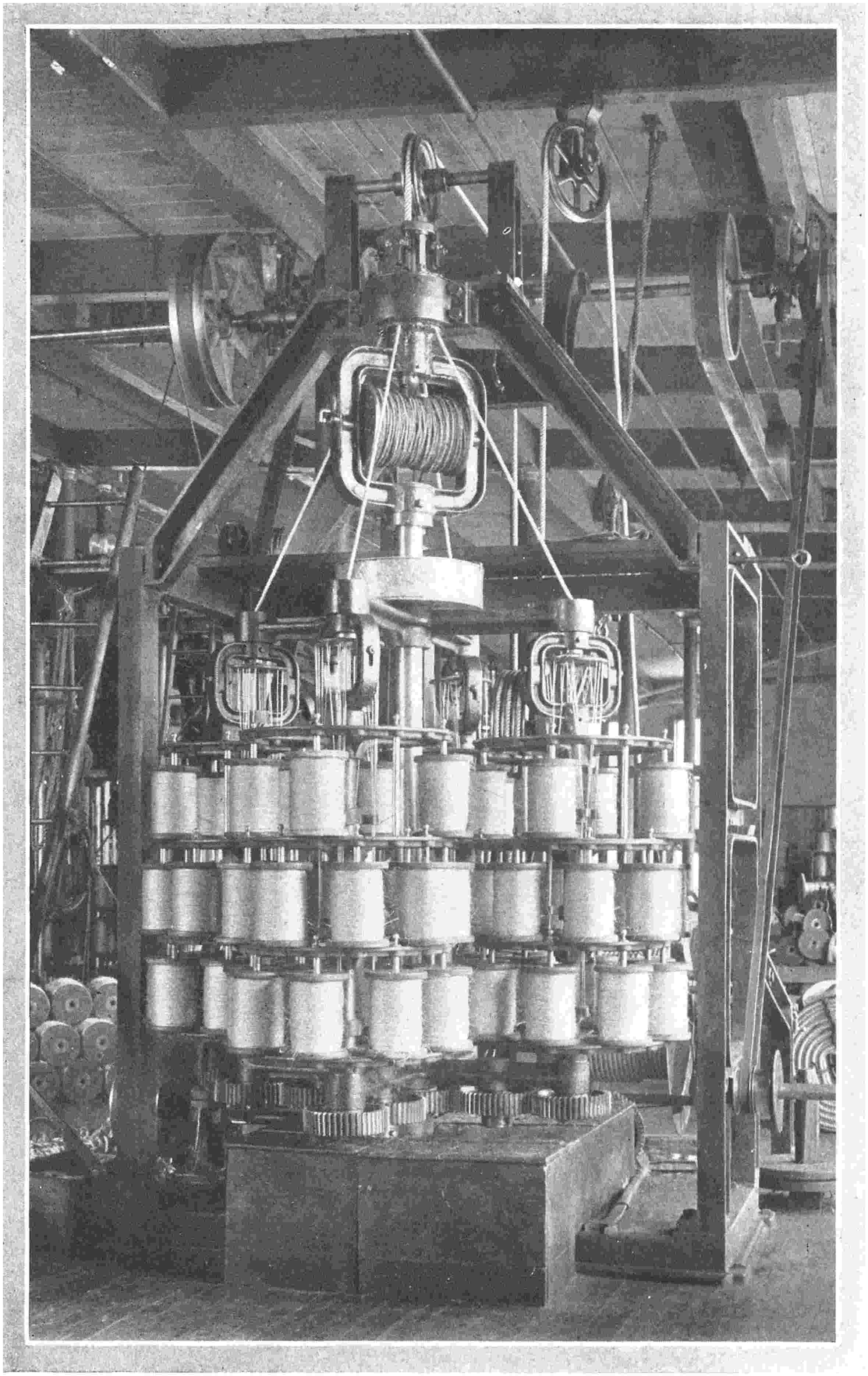 The yarns are first drawn from the bobbins through the perforated plates seen in the lower section of the picture, the entire number being so distributed as to converge in layers and at the proper angles around one central yarn. They next pass into a tube. Here the whole mass is compressed and at the same time is twisted by the revolution of the long carriage or flyer, which, as our picture shows, supports a winding-reel and two capstans.
