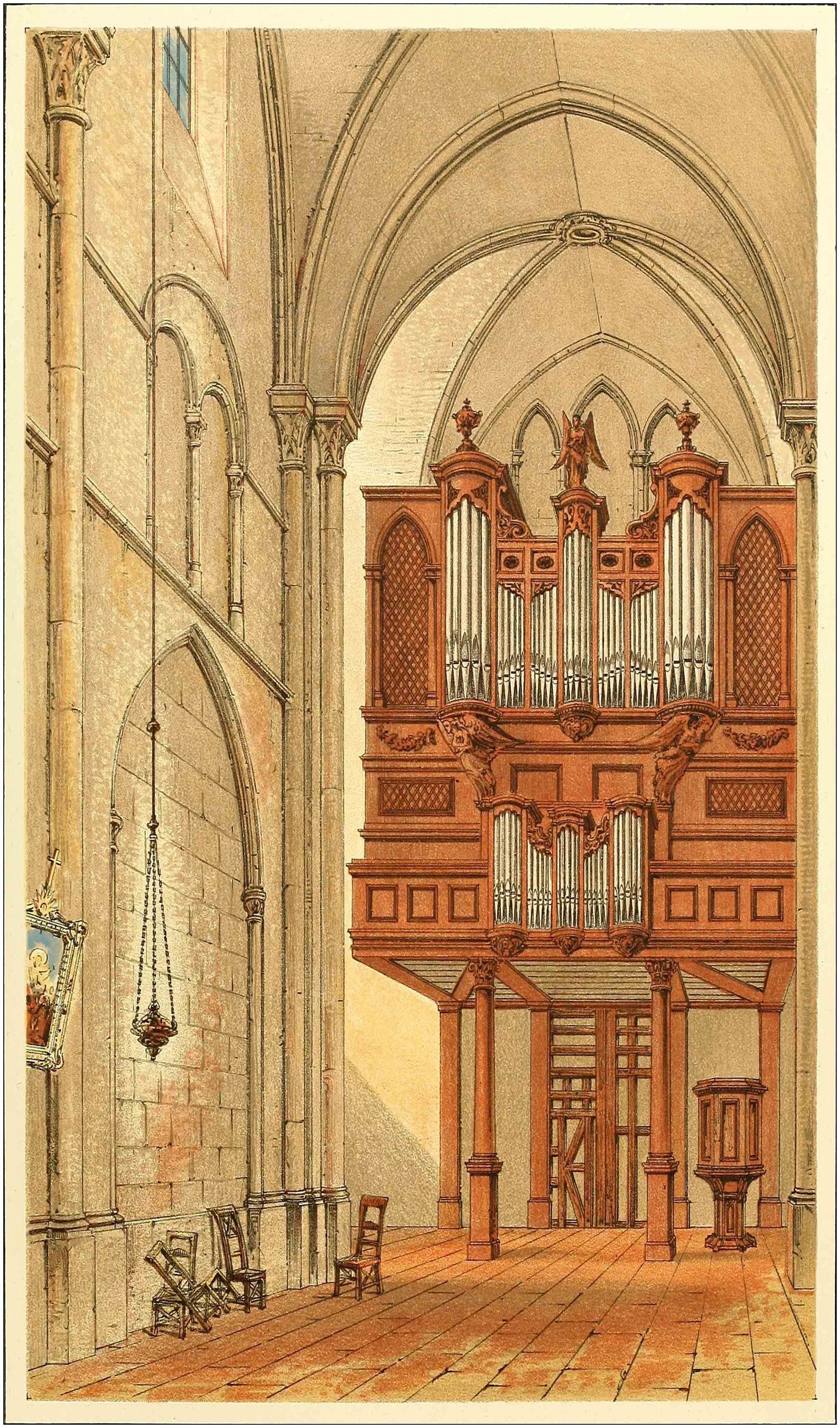 ST. NICOLAS.—This famous organ stands in a modern Gothic gallery at the west end of the Church. The outline of the case (which is also modern Gothic) is a large gable, having in the centre a tall tower, with two tiers of seven pipes each. The compartments on each side of this have each two tiers of pipes, between which is wood work, containing a rose of Gothic tracery. Beyond this is a tall tower of five pipes, then a flat of tall pipes, and the organ terminates at each end with a tower of five pipes. All the work is crowned with pinnacles and tabernacle work, the wood-work is pale oak, with gilding about it. Although intended to be a handsome case I do not quite like it. The tone of the organ is good, especially the echo, and the vox humana has a great renown. 1868.