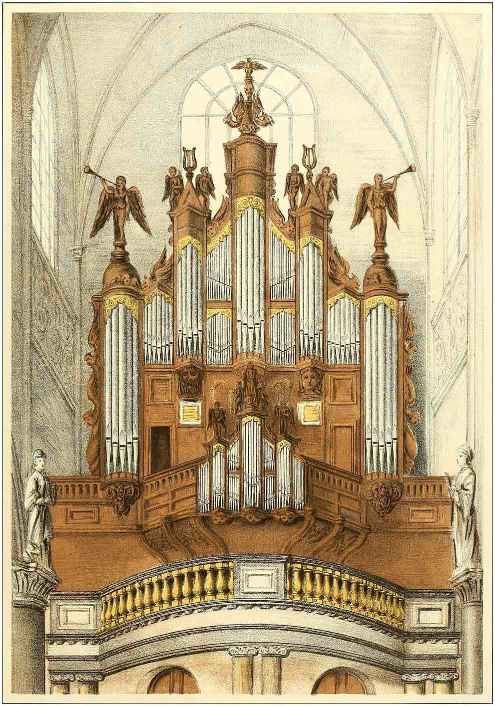 GROOTEKERK (St. Lawrence).—At the west end stands a very large organ. The centre tower, which is ninety feet high from the ground, and is crowned with an angel holding a trumpet, has two tiers of pipes, the lower containing fifteen, and the upper nineteen. On each side is a flat with three tiers of pipes; then a flat of four tall pipes; and at each end a tower surmounted with a vase, containing five pipes, belonging to the thirty-two feet stop, and which look very long and thin, as they have a rather narrow scale. On a bracket, outside the north tower, is an angel playing on the lute; on the south side, one who plays on the flute. The buffet, or lower part of the case, rises in a curve to the centre; the Choir Organ in front, has its tallest tower in the centre, surmounted by three angels; next to which is a flat of two tiers of pipes, seven in each; then a flat of four pipes, and at each end a tower of seven pipes. The organ loft is white, and supported by eight Ionic columns, with bronze capitals, and the culs-de-lampe of the three towers of the Choir Organ are also bronze. The pipes had gilt mouths, the wood-work was all brown oak, much carved with festoons of flowers, and sham curtains for claires-voies. I heard the organ at a week-day evening service, the tone was good, but wanting in fulness. I suspect I did not hear the full power. 1872.