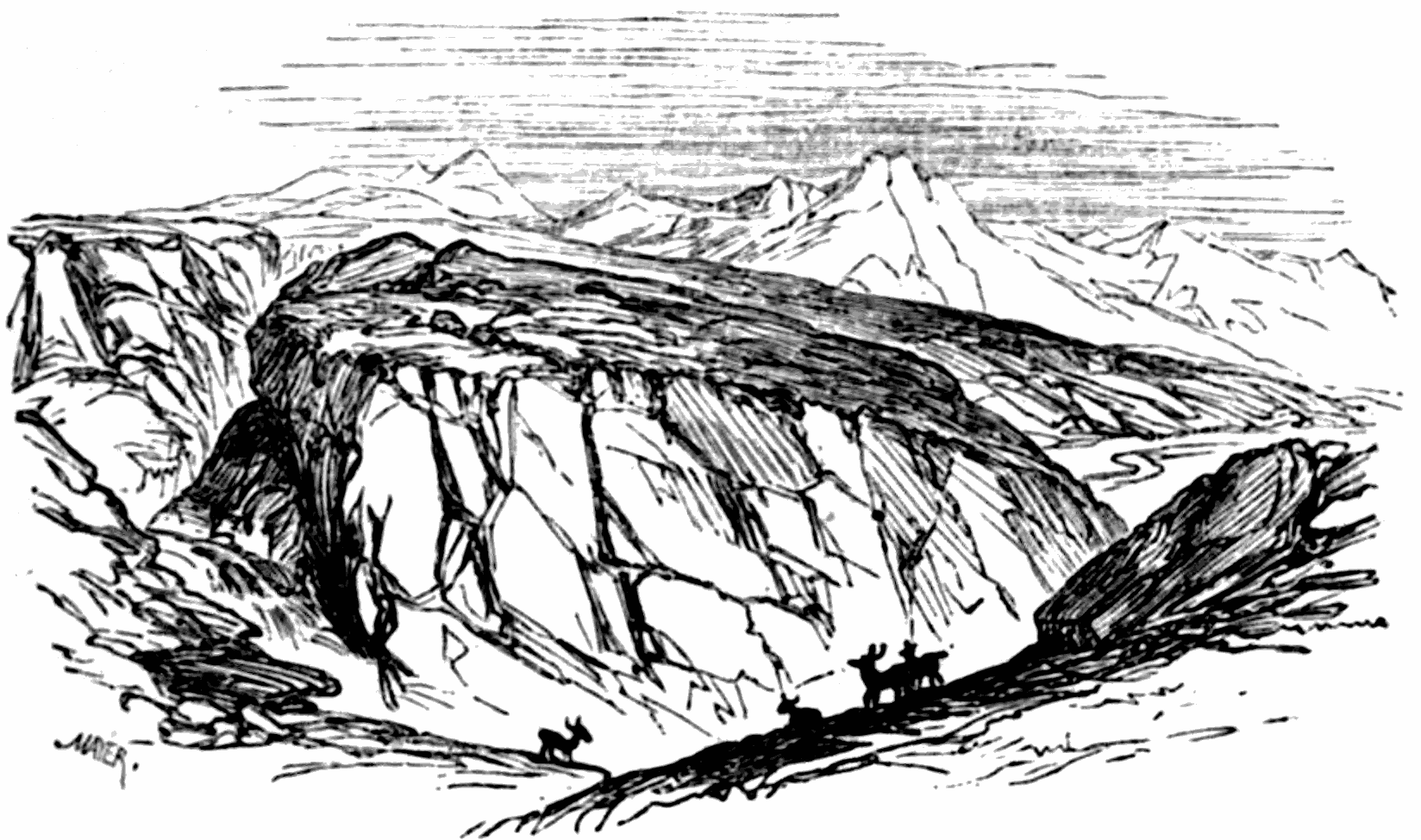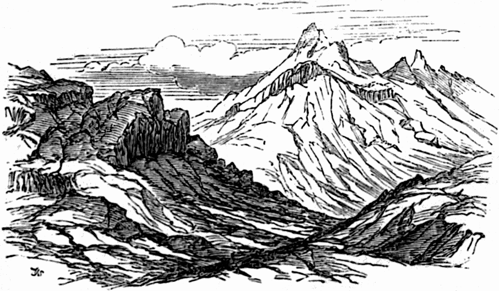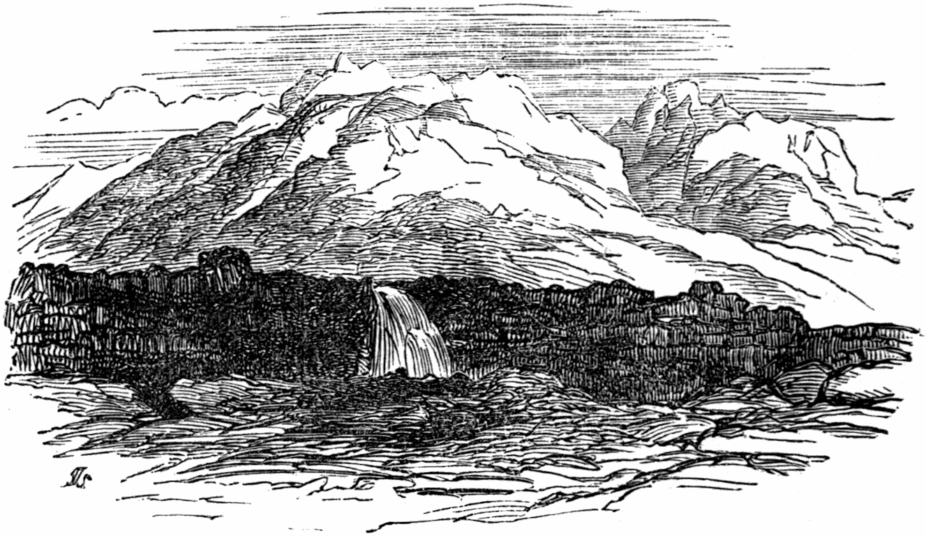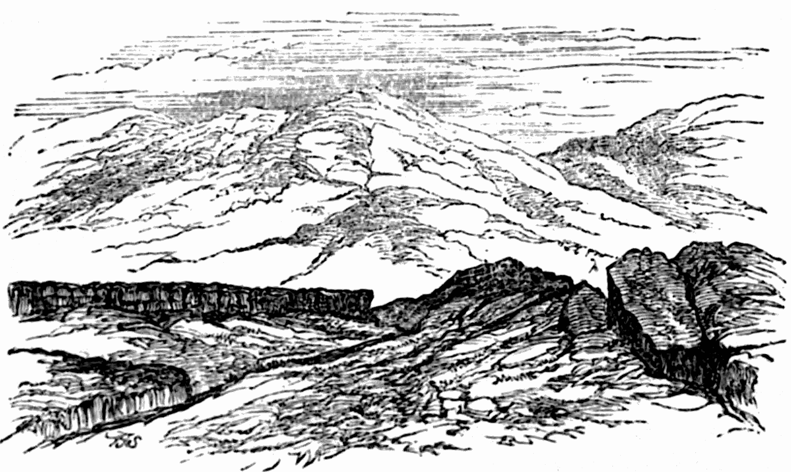 19. Since our visit, there has been another eruption of Kötlugjá in 1860, the particulars of which have been collected by Lauder Lindsay, Esq. M.D., F.L.S. &c., and published in the Edinburgh “Philosophical Journal” for January. From his interesting and admirable scientific paper, which treats the subject largely, we learn that this eruption, like that of 1823, was “mild and innocuous.” It began on the 8th, and continued to the 28th or 29th of May, and was preceded for several days by earthquakes. On the morning of the eighth a dark cloud was seen to rise from the mountain, which at the same moment sent forth an enormous flood of water, with very large pieces of ice, running with the water-stream into the sea. Some of the pieces of ice were so large that they were stranded at a twenty fathom depth in the sea. On the 12th of May the flames could be seen from Reykjavik, although this town is no less than about eighty English miles distant. During the evenings flashes of lightning were seen in the same direction. On the 16th May, the smoke was about twenty-four thousand (?) feet high; it was sometimes of a dark colour, but at other times it resembled steam. At this time the fire was seen from several places at a distance of about 80 English miles. The wind being northerly during the eruption, the sand and ashes fell chiefly in Myrdals-sand, which was the direction also taken by the water-floods. Sulphur was found floating in the sea, and the fish disappeared from certain parts of the neighbouring coasts. A large quantity of cinders was mixed with the water-floods. Cinders and balls of fire, as well as smoke, were thrown up; but the cinders and ashes, from being carried by the wind partly into the sea and partly to the neighbouring snow-fields, did comparatively little damage to the lowland farms; although the well-known devastations of former eruptions, especially those of 1665 and 1755, gave rise to extreme alarm and the most serious apprehensions among the poor inhabitants.