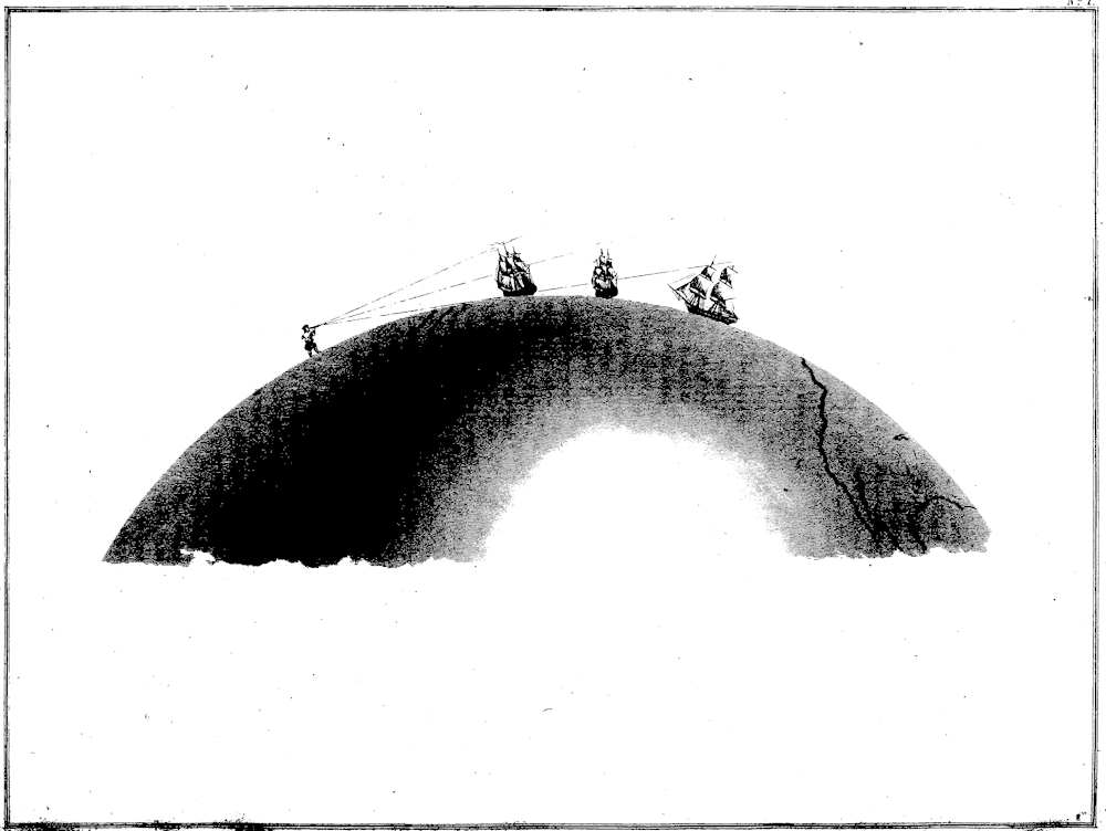 The man who is represented as standing on a portion of our Earth, will at first only see the topmast of a vessel at sea; when she comes nearer his eye will discover a much greater portion of her; but when in the third position every part of the vessel will be visible.