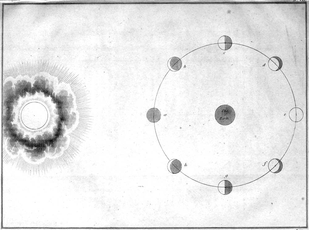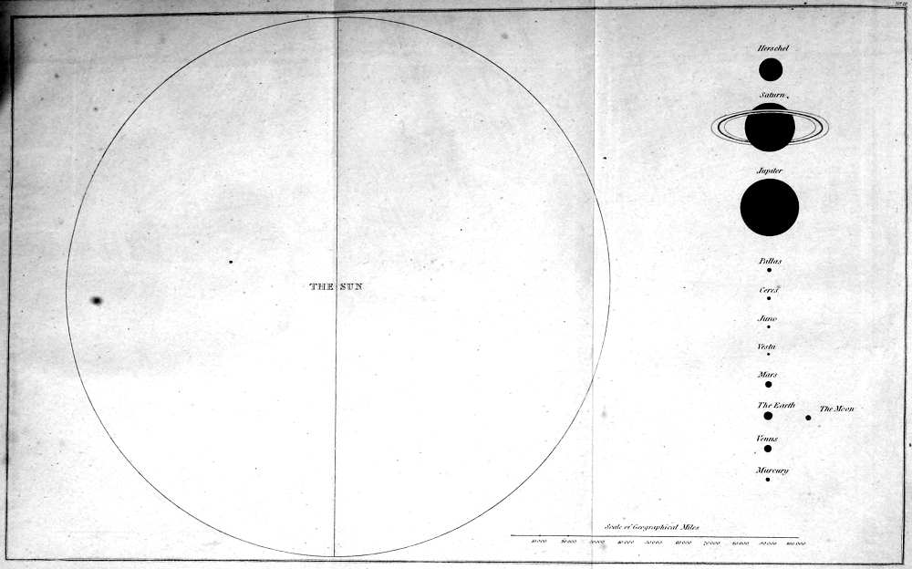 The adjoining diagram, on Plate No. II, may serve for an illustration. You will see from it, that the Earth is the third Planet from the Sun. Mercury and Venus come before it; the most remote from the Sun is Herschel, so called from the astronomer’s name, who has but lately discovered it.