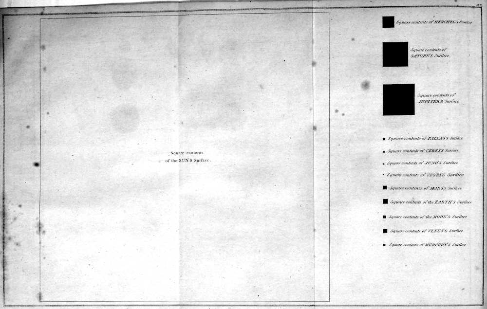 § 12. Plate No. IV represents the surfaces of the Planets, compared to that of the Sun.—For you must know that it is possible to measure the surface of a sphere; which is done by supposing it to be spread out, and then seeing how many square inches, feet or yards it contains. This we have supposed to be done with the surfaces of the Sun and Planets, and accordingly, have drawn their square measurements, in Plate No. IV. in proportion to each other.