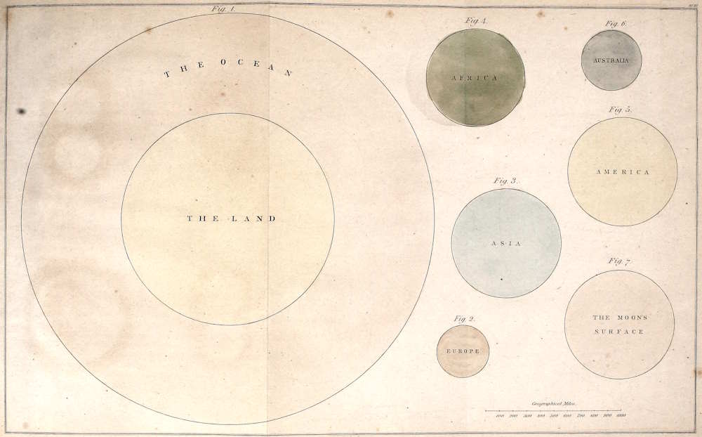 You will observe from a close inspection of these figures, that the whole extent of land on our globe is nearly equal to that of a temperate zone; and that if it were possible to unite America, Europe, Asia, Africa and Australia into one, their united extent would not yet fill one of the temperate zones! You will also perceive that the two temperate zones occupy together the greatest portion of the Earth’s surface, and that the arctic zones occupy comparatively the smallest.