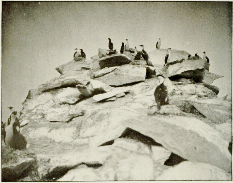 Are there not people or unknown animals in the regions around the south pole? Novelists have pictured this mysterious region since the time of Dalrymple, in 1760, with curious races of people and strange forms of animal life. It is the last unexplored expanse on the globe of sufficient area to offer room for fictitious creations of new worlds, and it will continue to be a special domain for imaginative writers for many years. From the explorations thus far, we have no reason to hope for any startling discoveries of human or other animal life. Borchgrevink, owing to his inexperience and hasty conclusions, mistook ordinary penguin tracks for the footprints of some large and unknown animal. No reliable traces of either large new animals or human beings have been found. The regions are, as homes for adapted people, far superior to the arctic lands, where the Eskimos periodically starve or live in blubbery abundance. If sailors or wild people were cast[462] adrift on the antarctic shores they would not necessarily starve. There is food and fuel, and even clothing, to be had from the seals and penguins everywhere. The life would not be full of comforts, if measured by our standards, but compared to Eskimo existence there is a decided advantage in life-sustaining prospects of the southern pole—not in climate or in the degrees of cold, but in the certainty of food. People then, if they once find a foothold, might easily thrive, but to the present we have found but one doubtful sign. This was reported by Captain Larsen, the Norwegian sealer, in 1893. Larsen found about fifty clay balls, perched on pillars of the same material, on Seymour Island, off the eastern coast of Grahamland. “These,” said Larsen, “had the appearance of having been made by human hand.”
