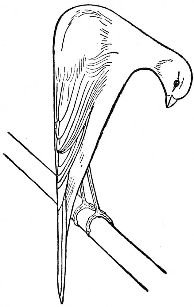 In the class of exhibition birds, perhaps none is more striking than the Belgian canary, pictured in Figure 2. Formerly known as the “king of the fancy,” it was reared extensively in Belgium, but of late years its popularity has been on the decline, so that as late as 1911 it was said that few pure-bred Belgians were to be found. The typical Belgian canary is a large bird with a small head, long, slender neck, large shoulders, and a long, tapering body. It is primarily a bird of “position.” When assuming the peculiar and desired attitude the bird throws its shoulders up and brings the head down well below their level; the back and tail form a perpendicular line and the feet are held close together.