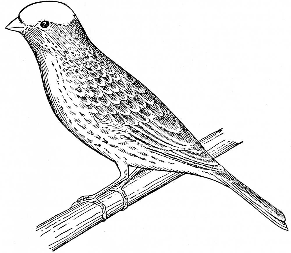 The original canary, whether serin or true wild canary, in its native haunt was much different in color from its modern pure-bred descendant. The back of the wild bird is, in general, gray, tinged with olive-green, especially on the rump, with dark shaft streaks on[Pg 3] the feathers. Underneath it is yellowish, streaked on sides and flanks with dusky. Wild canaries from the Canary Islands, the Azores, and Madeira differ from the Continental serins in being slightly grayer with less of yellowish green in the plumage above. In addition, the rump is duller yellow and the bill is distinctly larger. All the wild birds have the feet and legs (tarsi) horn brown, the upper half of the bill dark brown or horn color, and the lower half paler.