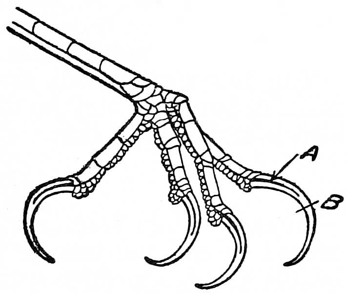 Fig. 6.—Diagram of foot of canary with overgrown claws. A, Terminal blood vessel; B, point at which claw may be trimmed without injury.