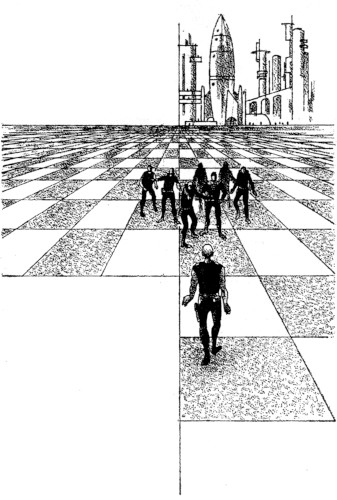 There were eight men in this first group to leave the craft. They started across the vast and empty checkerboard area leading from the gantry to the sparkling Reception Center building. At least in one respect, despite three decades of increasingly erratic behavior, Nodar was following standard procedure; interstellar spaceports always were laid out in huge black and white squares. From the distance which was emphasized by this linear perspective a solitary figure was coming toward them square by square.