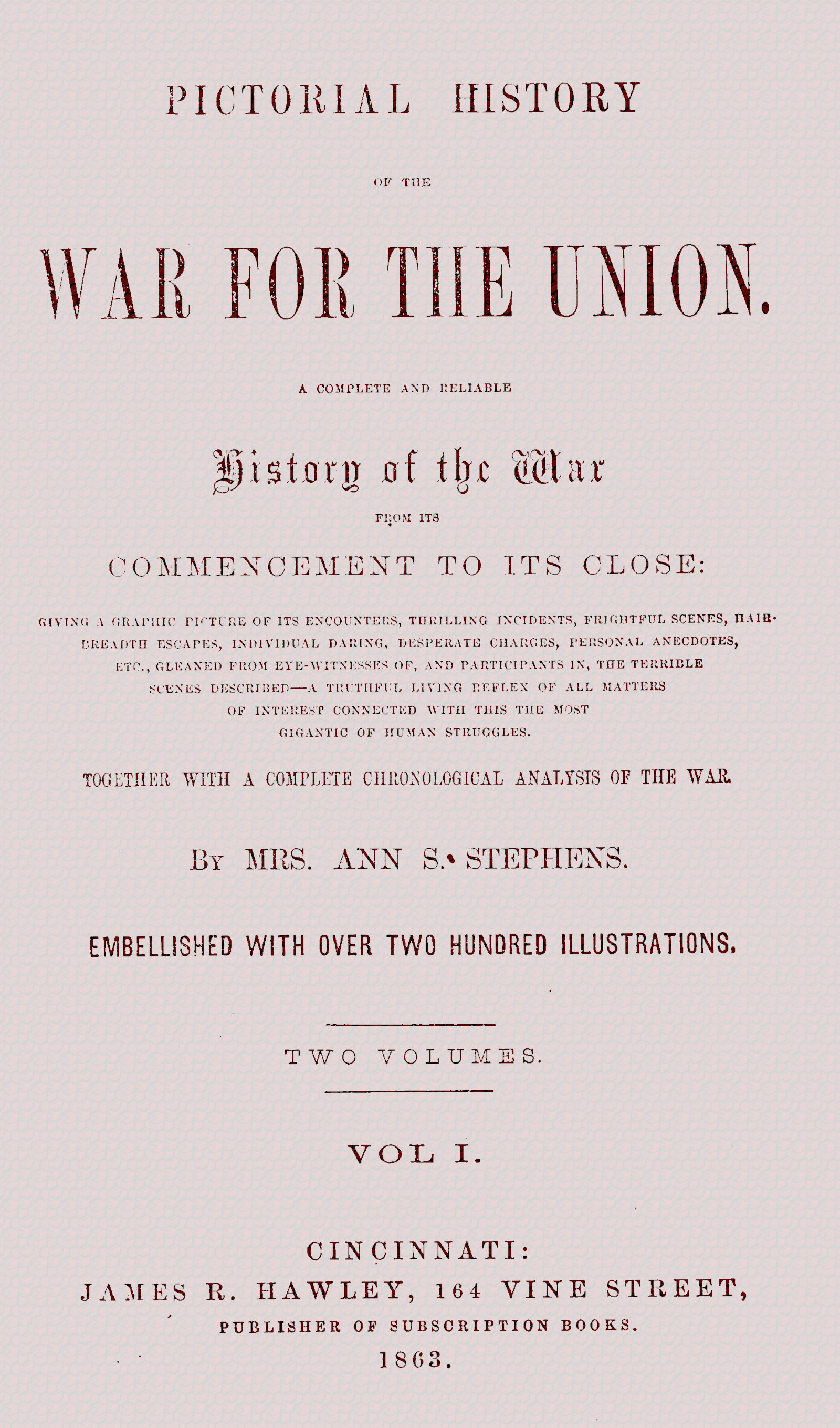 The History of the War for the Union is a record of stupendous events which have given grandeur to the American arms and sorrow to every good American heart. Taking up the thread of events where the political history of the nation left them on the fourth of March, eighteen hundred and sixty-one, the author has followed the ensanguined track, giving to every battle-field its place, and every heroic act its record. The sources of information in which the work has found its existence, have been authentic reports from the War Department, the official statements of commandants on the battle-field, and the many thrilling and graphic descriptions furnished by eye-witnesses.