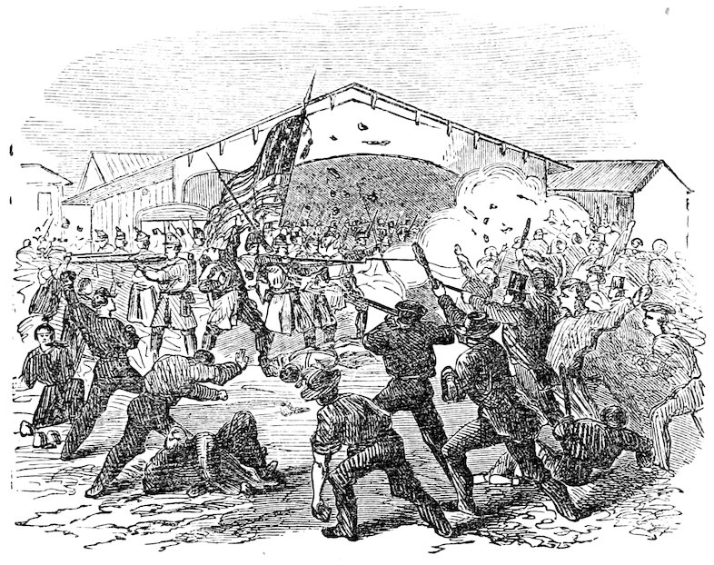 | Arrival of the Massachusetts Sixth, Col. Jones, in Baltimore—Blockade of the streets—Attack by the mob—Defence of the military—Terrible results—The regimental band—The city authorities—Intense excitement of the citizens—Pennsylvania troops—Mayor Brown and Marshal Kane. | ||