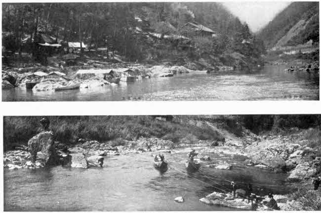 The accessories and incidents of my second excursion to the rapids of the Katsura-gawa were of a totally different order. The day was in early March of 1907, bright and beautiful, but somewhat cool for such a venture. At the Nijo station—for one could now reach the upper rapids by rail—my wife and I met President Harada and one of the lady teachers of Doshisha, and two of the Professors of the Imperial University. Passes and a present of envelopes containing a number of pretty picture cards, from the Manager of the Kyoto Railway Company, were waiting for the party. The ride to the village of Kameoka was pleasant, although even the earliest of the plum blossoms had not yet appeared to beautify the landscape.