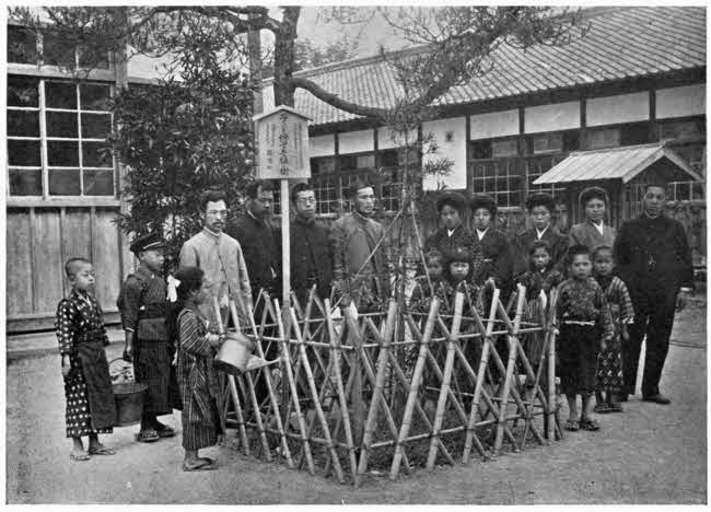 After luncheon was finished, I assisted at the planting of two small fir-trees just in front of the[37] building, by dropping into the hole the first two or three mattocks full of earth. We were then conducted to the play-ground near by, where the whole school was drawn up in the form of a hollow square. Here, from one end of the square, I spoke to the children for not more than ten minutes, and President Harada interpreted; after which the head-master made a characteristically poetical response by way of thanks,—saying that the memory of the visit and the impression of the words spoken would be evergreen, like the tree which had been planted, and expressing the wish that the future long lives of both their guests might be symbolised by the life of the tree. To tend these trees became a privilege for which the pupils of the school have since kept up a friendly rivalry.