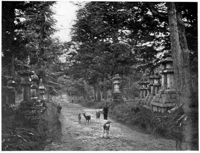 Arashi-yama, made picturesque by its hills everywhere covered with pine trees, its plantations of cherry trees which are said to have been brought from Yoshino in the thirteenth century by the Emperor Kameyama, and its justly celebrated maple groves, was an appropriately beautiful spot for the termination of our excursion. After taking luncheon in one of its tea-houses,—my first meal, squatted on the mats, in Japanese style,—my host and I left the rest of the party and went back to his home in the city by jinrikishas. On the way we stopped at one of those oldest, smallest, and most obscure of[34] ancient temples, which so often in Japan are overlooked by the tourist, but which not infrequently are of all others best worth the visiting. Here the mild-mannered, sincere old priest opened everything freely to our inspection, lighted the tapers and replenished the incense sticks; and even allowed us the very unusual privilege of handling the sacred things about the idols. Finally, putting a paper-covering over his mouth, and after much prayer, he approached on his knees the “holy of holies,” drew aside the gilt screens and showed us the inner shrine; and he then took out the shoes belonging to the god and let us handle and admire them.