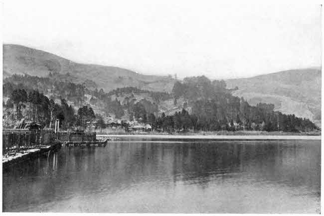 The excitement of the ride did not in any respect interfere with a constant and increasing admiration of the charm of the scenery along the banks of the river. The canyon of the stream and the surrounding hills were equally beautiful. The nearer banks were adorned with bamboo groves, the attractiveness of whose delicately contrasted or blended light and shadows has already been referred to; and at this season, great clumps of azaleas—scarlet, pink, and crimson—made spots of brilliant colouring upon the sober background of moss and fern and soil and rock.