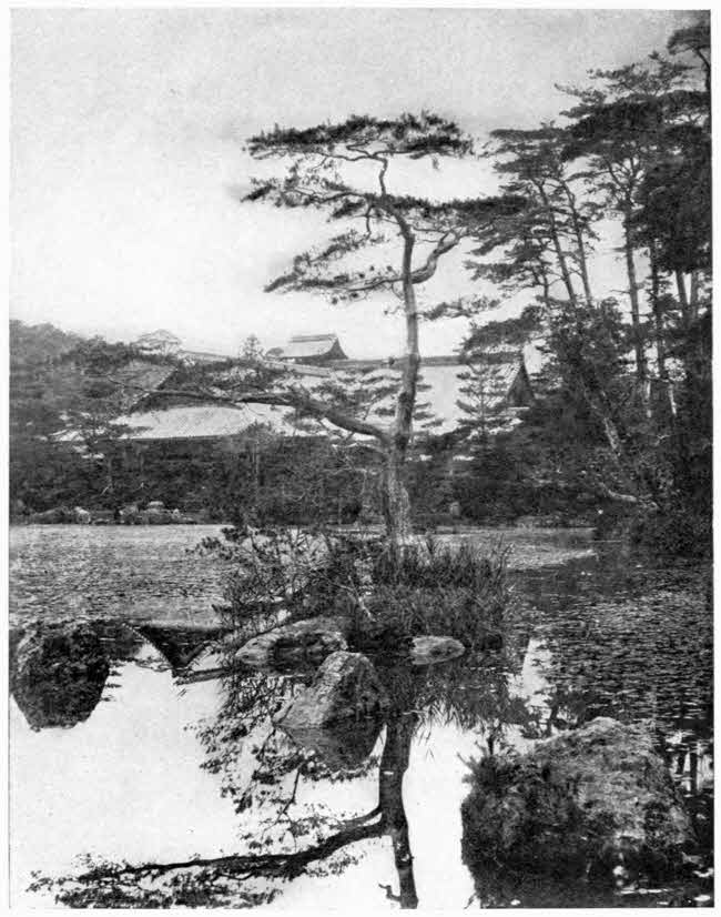 A regular “shore dinner” of fish and birds was somewhat hastily concluded, in the company of the Governor of the Ken, the Mayor of the City, and a representative of the Educational Societies. Immediately after this, the Governor excused himself and, mounting his bicycle, went on ahead of us, who followed in jinrikishas. The highway along which we passed rapidly, was, for much of the three miles between the coast and the city, made picturesque with its shading of pines; and once within the more thickly settled streets of Wakayama it circuited the castle walls and brought us to the Government-building where the afternoon’s lecture was to be given. Here, as everywhere, the audience, which numbered about eight hundred teachers and officials, many of whom had come from considerable distances away, bore convincing testimony to the interest of the Japanese people at large in questions of education and ethics. But we were not to carry out the plan of seeing more of the sights and of the people of Wakayama. For a telegram informed me that Marquis Ito had already left Oiso and would reach Kyoto that evening, where he would plan to see me the next morning. Directly from the hall,[310] therefore, we were taken in haste to the station, and by late evening we had reached our hotel in Kyoto.