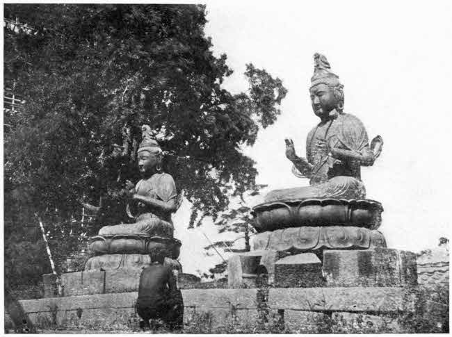 From his point of view, the pious custodian of the sacred relics was indulging in an altogether justifiable pride. For the temple of Uzumasa is one of the oldest in Japan. It was founded in A. D. 604, by Shōtoku Taishi, the Japanese Constantine, who consecrated it to Buddhist gods whose images had been brought from Korea. Although the original buildings were burned some centuries ago, the relics and specimens of the most ancient art were fortunately saved. Nowhere else in the whole country, except at Nara or Hōryūji—and there only to those who are favoured with special privileges by the Government—can such a multitude of these things be seen[35] and studied. The antiquarian interest in them is just now enhanced by the fact that many of them, although called Japanese, were really made either in Korea or else under the instruction of Korean teachers. It is one of the shiftings of human history which has now placed upon the Japanese the responsibility of instructing in every kind of modern art their former teachers.