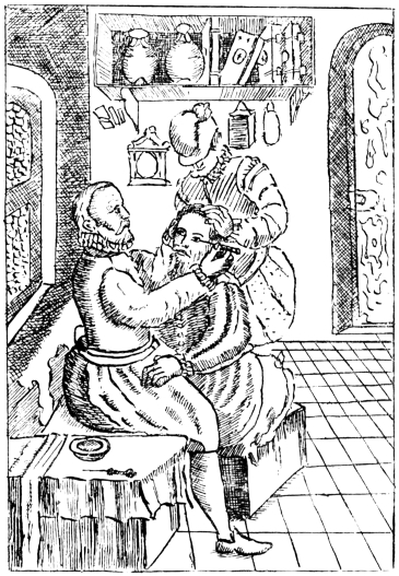 Fig. 1.—The positions of the patient, operator, and assistant, as depicted by Bartisch (Albertotti).