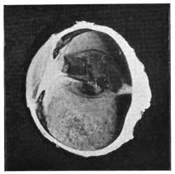 Fig. 45: Specimen No. 131.—A large Morgagnian lens in its capsule was adherent to the iris base, the ciliary body, and the neighbouring retina over a wide area. The capsule ruptured during the transit of the specimen from India. Note the thickened white dots upon it; they are characteristic of Morgagnian cataract. The large brown nucleus, which escaped when the capsule burst, now lies free in the cavity of the eye; notice the “bite” out of its edge. The optic disc was deeply cupped, and the angle of the anterior chamber was widely obliterated, the chamber itself being very shallow.
