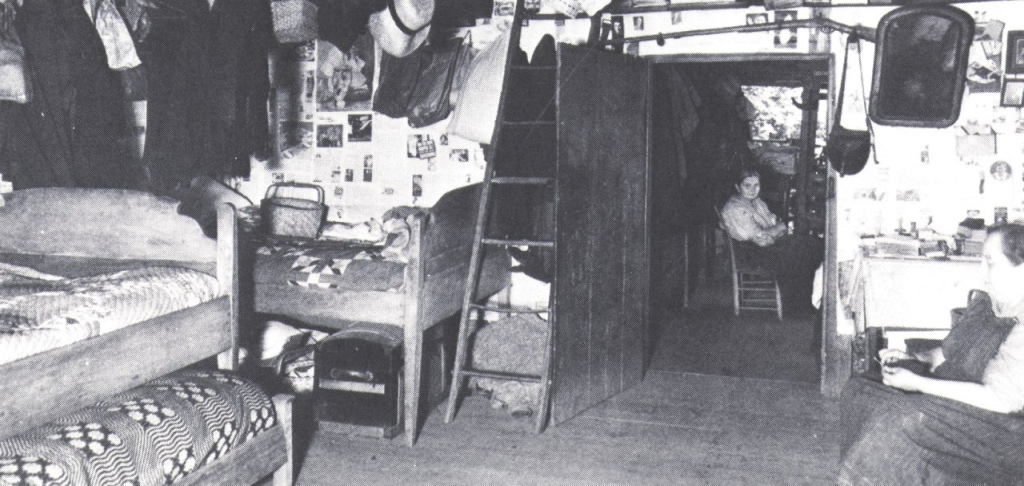 The log house here is a particularly nice one, for John Davis built it with matched walls. He split the logs in half and used the halves on opposite walls. The two stone chimneys are typical of the earliest houses. Davis’ sons, then 8 and 4, collected rocks for the chimneys with oxen and a sled.