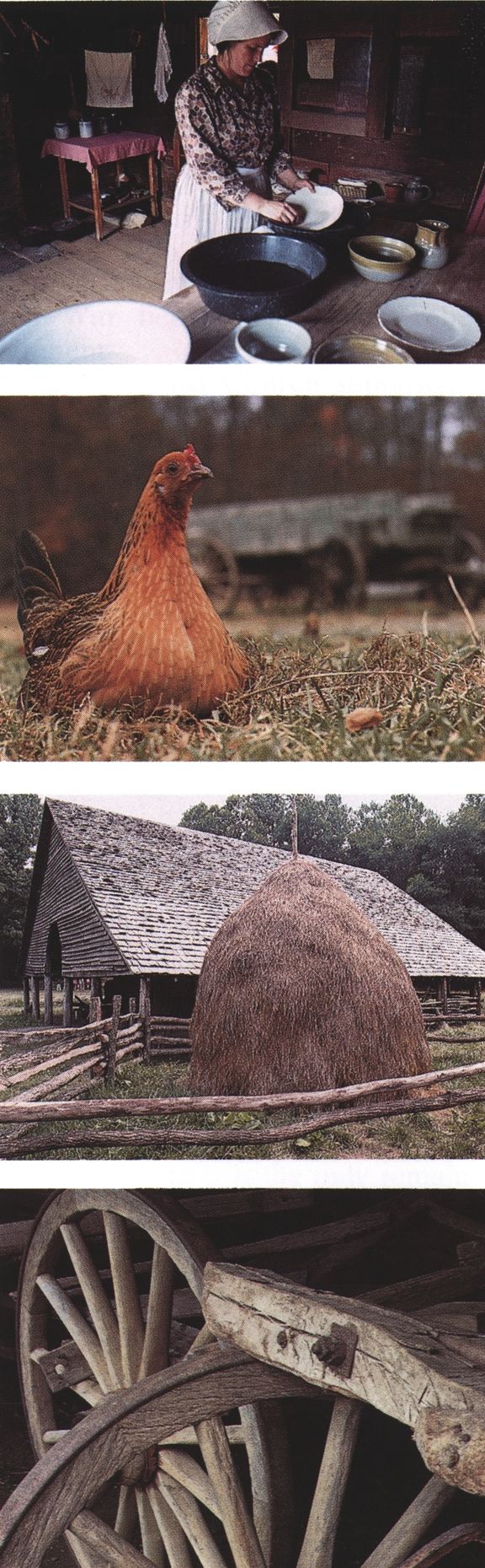 In the summer and fall farm animals roam about the farmstead and a man and a woman carry out daily chores to give you an idea of what the pioneers had to do just to exist. At first these Jacks- and Jills-of-all-trades had no stores to go to. They made their own tools, built their own houses and barns and outbuildings, raised their own food, made their own clothes, and doctored themselves, for the most part.