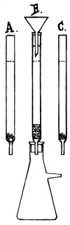 Separation of Phosphoric Acid.—The united filtrates from the two determinations are placed in a graduated flask and made up to the mark. An aliquot portion of this solution representing half a gram of [Pg 320] the original ash or any other convenient quantity is transferred to a beaker and a solution of ferric chlorid added until ammonia produces a brown precipitate in the mixture. Neutralize with ammonia and hydrochloric acid alternately until the liquid is as little acid as it can be and still remain clear. Add from ten to twenty cubic centimeters of a solution of sodium acetate (1:10) and bring to a boil. The liquid should be quite dilute. Filter and wash free of chlorids with boiling water containing some sodium acetate.