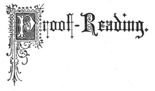 Proof-Sheet.—When the copy is set up in type, an impression in ink is taken for corrections. This is called a proof-sheet. In correcting proof, the first thing to be done is to place the copy in the hands of some one to read aloud, while the proof-reader pays attention principally to omissions, the spelling and capitalization of words, and punctuation. After this, the proof should be carefully examined to detect what are called typographical errors, that is, mistakes in type.