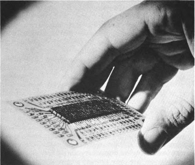Memory circuits once were mechanical relays or tube circuits. Briefly they were transistorized, and then ferrite cores. Magnetic thin-film circuits have now been developed, making random-access storage almost as compact as the sequential tape reel. As circuits grow smaller the major problem is manipulating them, or even seeing them, and a sneeze can be disastrous in today’s electronics plant.