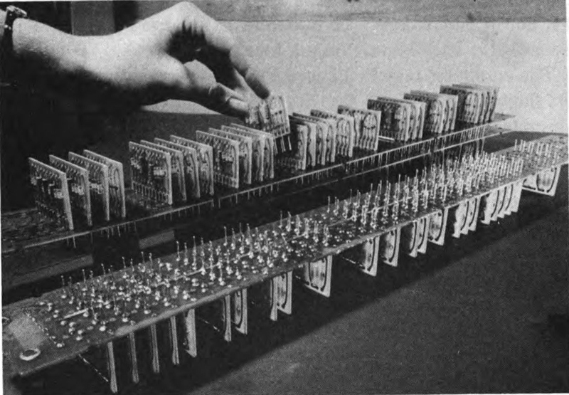 One such development was the transistor and other semiconductor devices. Tiny and rugged, these components require little power. With the old vacuum-tubes replaced, computers shrank immediately and dramatically. On the heels of this micro-miniaturization have come new and even smaller devices called “ferrite cores” and “cryotrons” using magnetism and supercold temperatures instead of conventional electronic techniques.